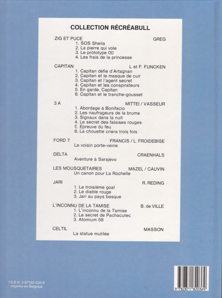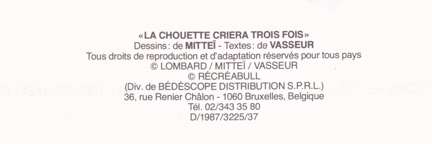 Info édition : © LOMBARD / MITTEÏ / VASSEUR © RÉCRÉABULL (Div. de BÉDÉSCOPE DISTRIBUTION S.P.R.L.). Réédition (en couleur) des Ed. Bédéscope (en N & B) de 1979. D/1987/3225/37. Mentionné en page 32 Printed in Belgium LESSAFRE SPRL 7500 Tournai.