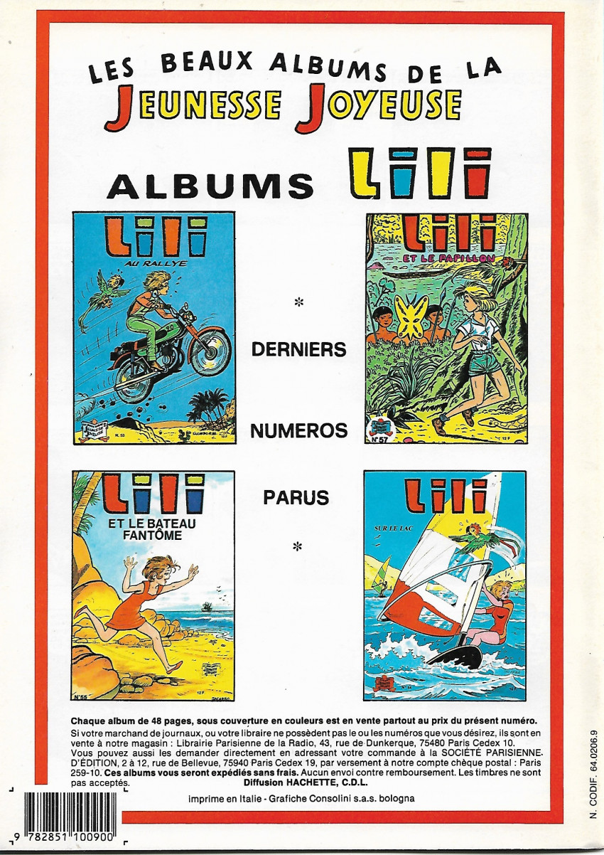 Info édition : DL 3° trimestre 1988 - Dernier titre de Lili paru (au 2° plat) : n°57 (Lili et le papillon), sorti en 1987.
