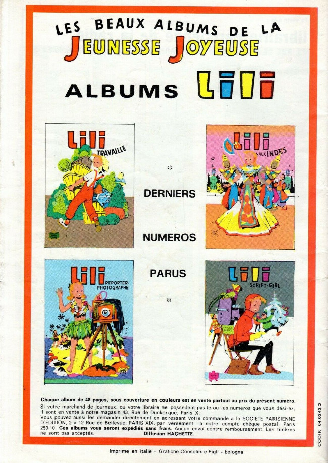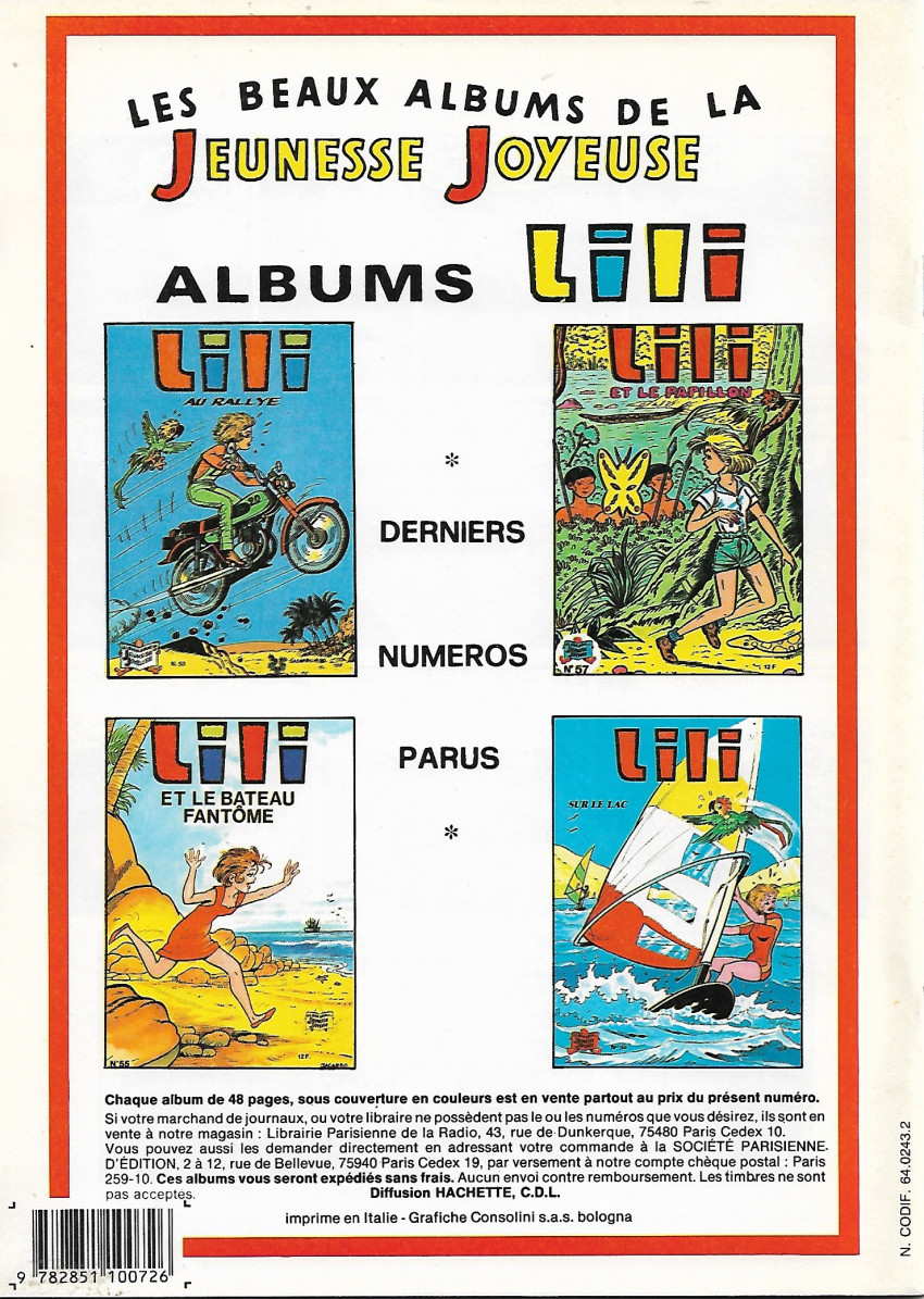 Info édition : DL 3° trimestre 1988 - Dernier titre de Lili paru (au 2° plat) : n° 57 (Lili et le papillon), sorti en 1987.