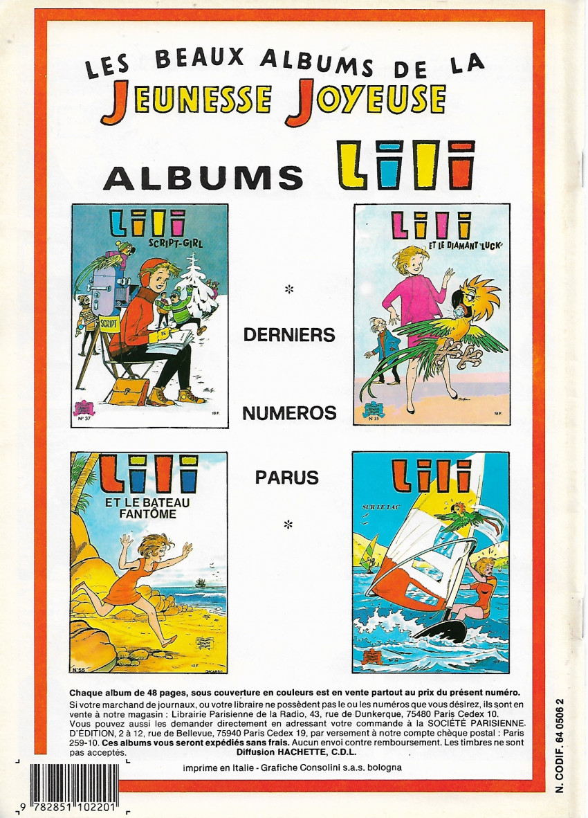 Info édition : DL 3° trimestre 1987 - Dernier titre de Lili paru (au 2° plat) : n°55 (Lili et le bateau fantôme), sorti en 1986.