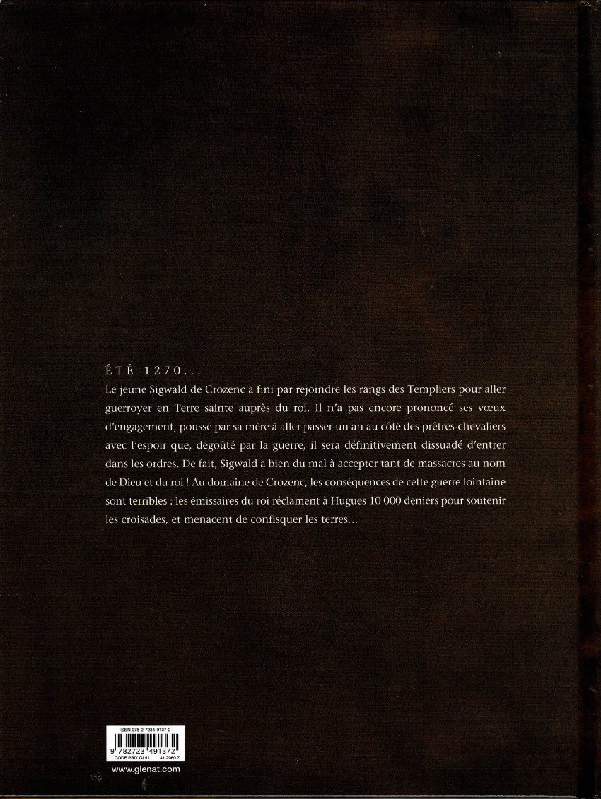 Les croisades, ici et là-bas… Le jeune Sigwald de Crozenc a fini par rejoindre les rangs des Templiers pour aller guerroyer en Terre sainte auprès du roi. Il na pas encore prononcé ses vux dengagement, poussé par sa mère à aller passer un an au côté des prêtres-chevaliers avec lespoir que, dégoûté par la guerre, il sera définitivement dissuadé d'entrer dans les ordres. De fait, Sigwald a bien du mal à accepter tant de massacres au nom de Dieu et du roi ! Au domaine de Crozenc, les conséquences de cette guerre lointaine sont terribles : les... Lire la suite