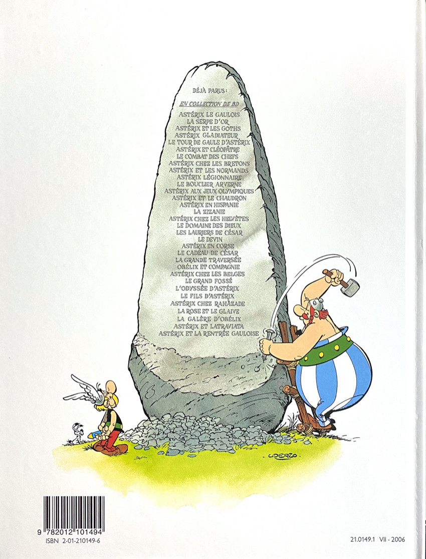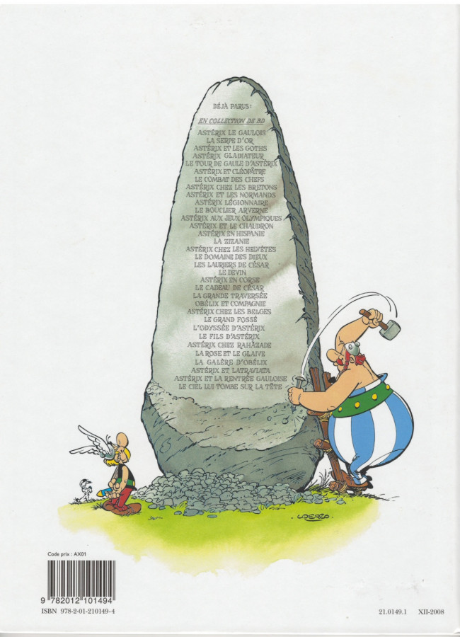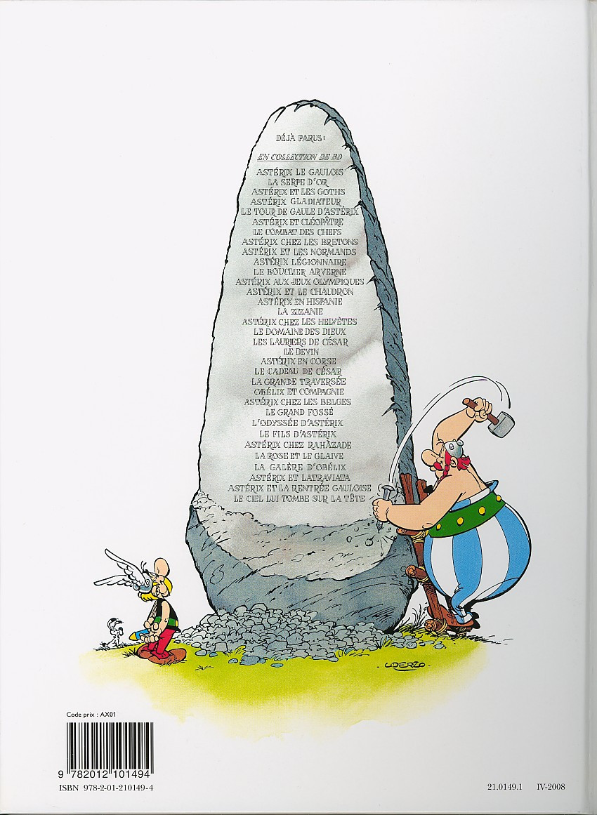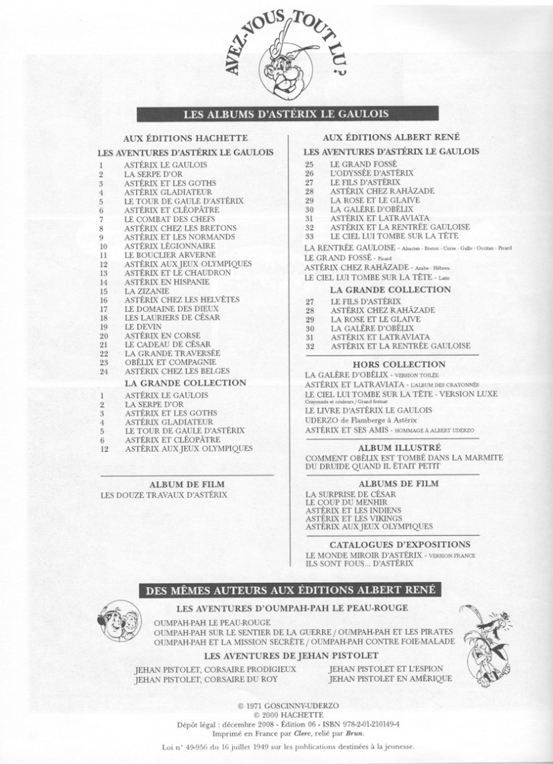 Info édition : 4e plat : 33 titres parus le dernier étant «Le ciel lui tombe sur la tête». code barre à gauche Page 48 noté : 1971 GOSCINNY-UDERZO . 2000 HACHETTE ; Dépôt légal décembre 2008 – édition 06