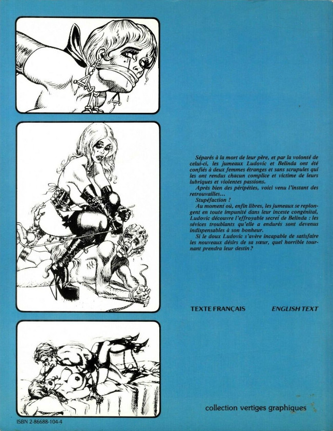 Séparés à la mort de leur père, et par la volonté de celui-ci, les jumeaux Ludovic et Belinda ont été confiés à deux femmes étranges et sans scrupules qui les ont rendus chacun complice et victime de leurs lubriques et violentes passions. Après bien des péripéties, voici venu l'instant des retrouvailles... Stupéfaction ! Au moment où, enfin libres, les jumeaux se replongent en toute impunité dans leur inceste congénital, Ludovic découvre l'effroyable secret de Belinda : les sévices troublants qu'elle a endurés sont devenus indispensables à son... Lire la suite