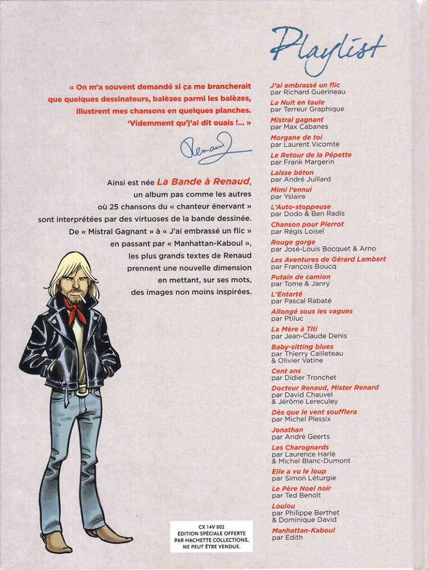 Parcourez la carrière de renaud en BD. De Laisse béton à Toujours debout en passant par Mistral gagnant, les plus grands auteurs du 9ème Art contribuent à l'album, chacun s'emparant de sa chanson favorite. L'histoire d'amour entre renaud et la bande dessinée est connue et semble ne jamais devoir finir. Loisel, Margerin, Rabaté, Boucq, Juillard... Plus d'une vingtaine d'auteurs parmi les plus prestigieux se sont prêtés avec bonheur au jeu de l'adaptation en BD de ses chansons et nous livrent un album à la fois drôle et touchant, à l'image de la... Lire la suite