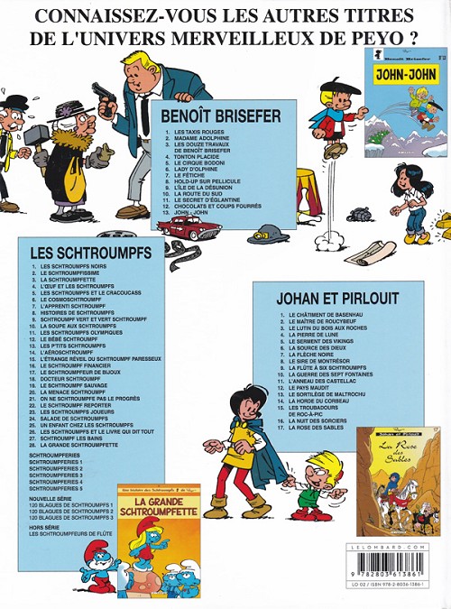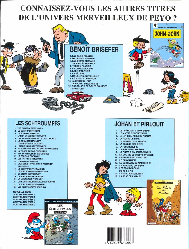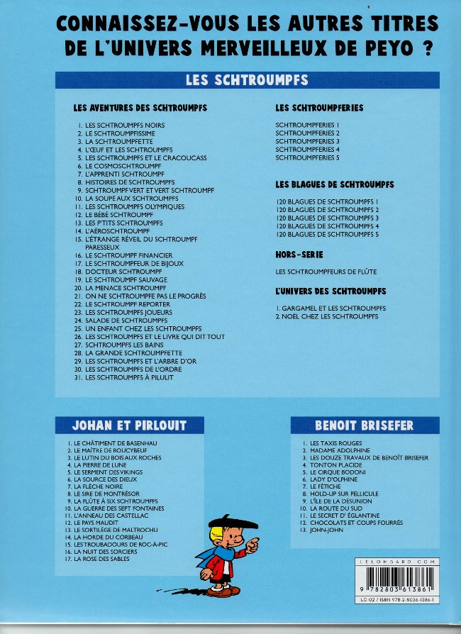 Info édition : D/2005/0086/499. R 03/2013 Au 4e plat sont indiqués 31 titres des Schtroumpfs, 17 de Johan et 13 de Benoît.