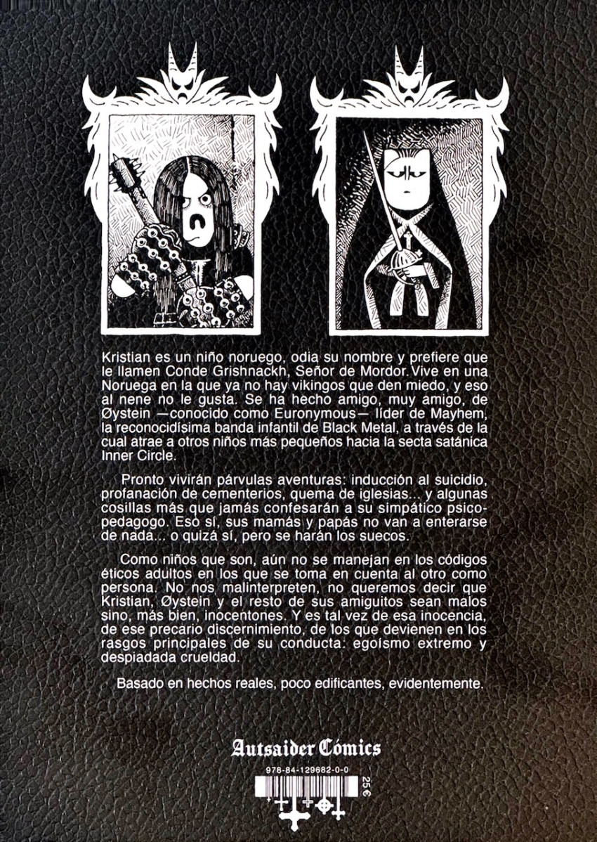 Kristian es un niño noruego, odia su nombre y prefiere que le llamen Conde Grishnackh, señor de Mordor. Vive en una Noruega en la que ya no hay vikingos que den miedo, y eso al nene no le gusta. Se ha hecho amigo, muy amigo, de Øystein —conocido como Euronymous— líder de Mayhem, la reconocidísima banda infantil de Black Metal, a través de la cual atrae a otros niños más pequeños hacia la secta satánica Inner Circle. Pronto vivirán párvulas aventuras: inducción al suicidio, profanación de cementerios, quema de iglesias… y algunas cosillas más que... Lire la suite