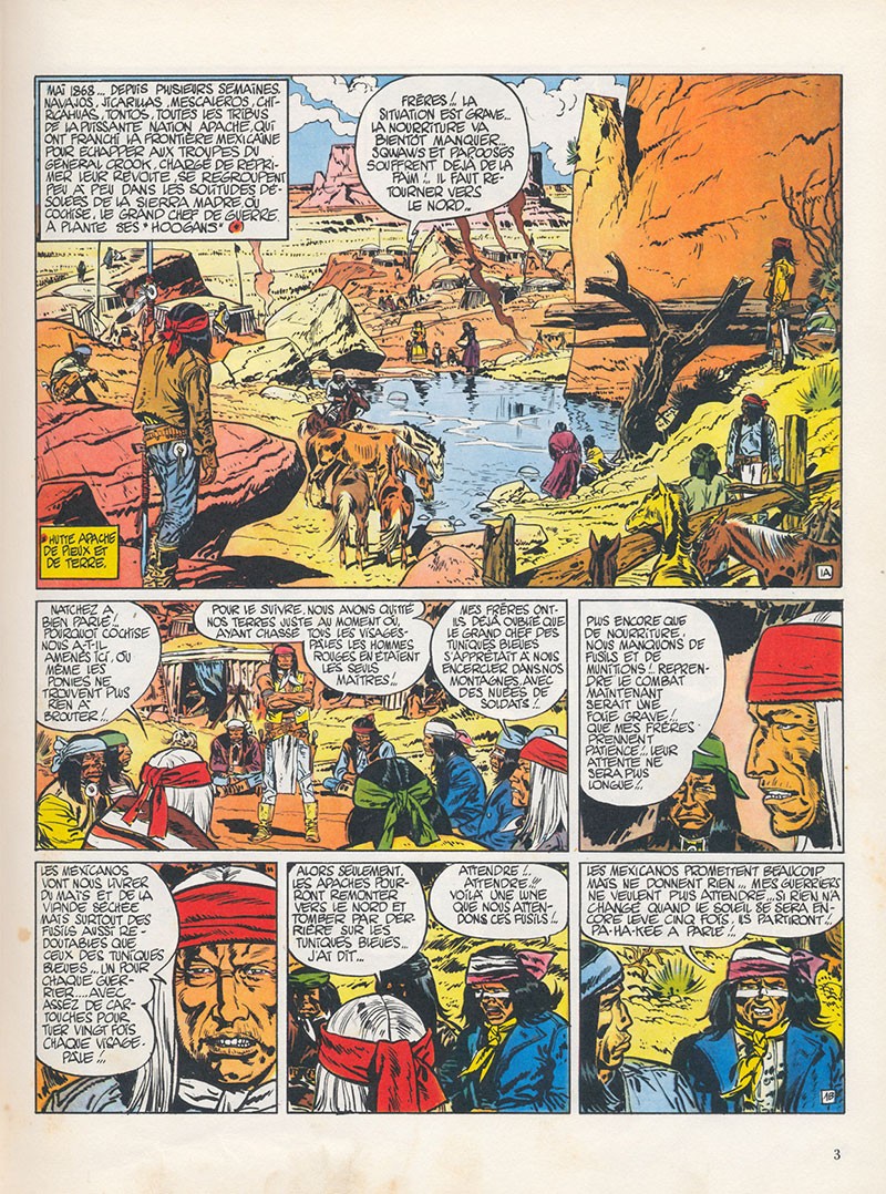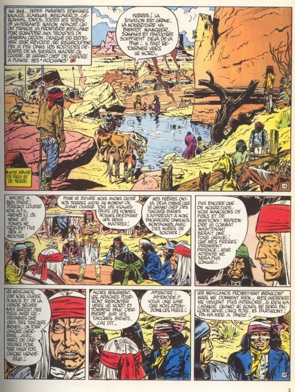 C’est une bédé très ciblée aventure et action, il faut aimer les Westerns et le style des bédés année 60/70. Les dessins sont chouettes pour l’époque avec parfois de belles couleurs bien vives et l’histoire intéressante ; le Lieutenant Blueberry devra coûte que coûte se démener pour rétablir la paix entre les Indiens et le gouvernement Américain. C’est parfois un peu facile mais pourquoi pas. C’est un style, j’aime bien.