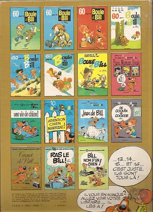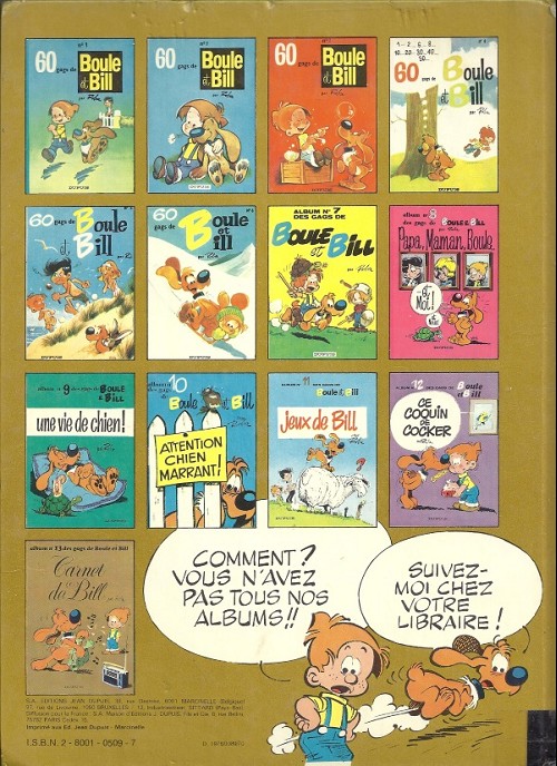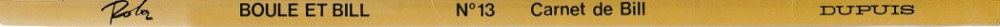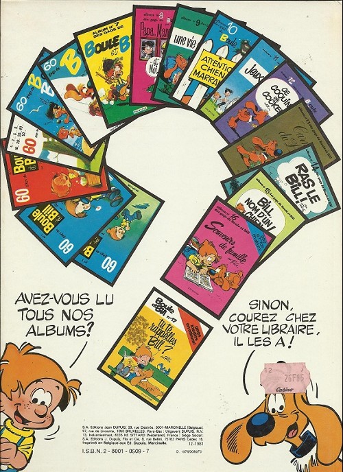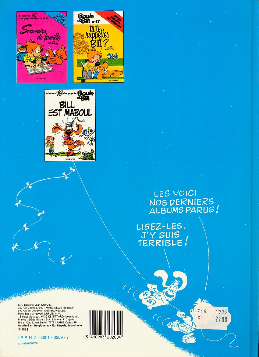 Info édition : Noté en page 2 : (c) 1976 BY ROBA AND S.A. EDITIONS JEAN DUPUIS. Noté au 4e plat : "9-1979" ; y figurent tous les albums jusqu'au 15 "Bill, nom d'un chien !".