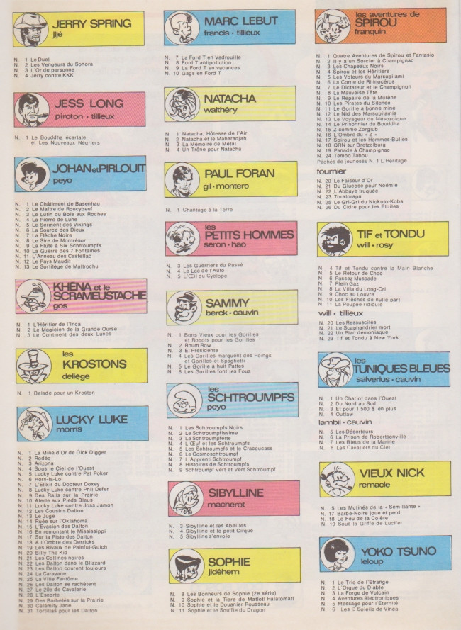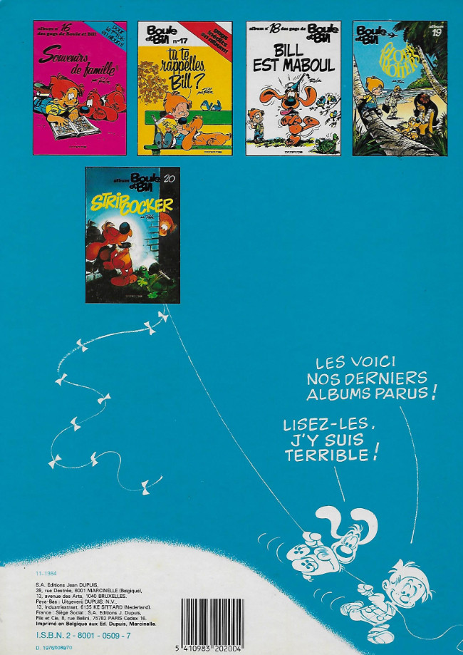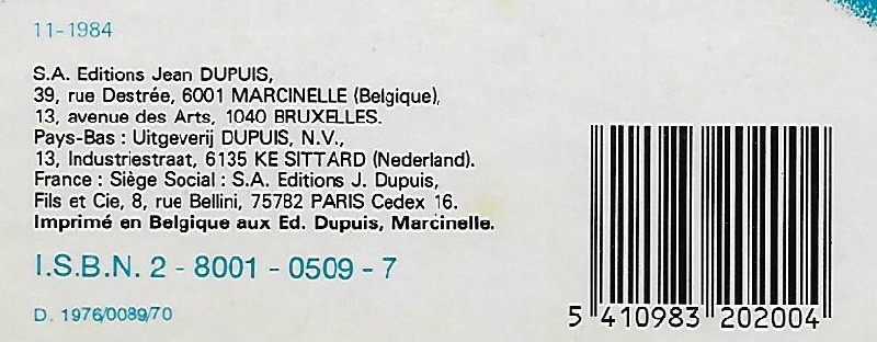 Info édition : Au 4ème plat, il est noté "12-1985" au-dessus des coordonnées de l'éditeur. ISBN = 2-8001-0509-7 et D. 1976/0089/illisible. Code barre à droite. Premier titre : n°16 "Souvenirs de famille" et dernier titre : n° 20 / "Stripcocker".