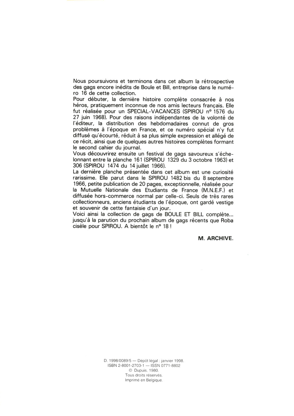 Info édition : Dépôt légal en page 2 noté "novembre 1991" D.1980/0089/21 Sur le 4e plat l'image des albums 16 à 21 avec sur le coin supérieur droit du n°16 un bandeau bleu sur lequel est indiqué "pour la 1ère fois en album !" et sur le coin supérieur droit du n°17 un bandeau rouge sur lequel est indiqué "gags inédits en album !". L'ISBN indiqué sur le 4e plat correspond bien à celui indiqué sur la 2e page.