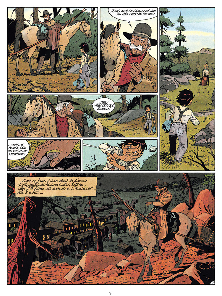 Bone hérite d’un jeune garçon muet qui lui sert de compagnon, bien malgré lui, jusqu’à sa destination finale. La tête de Bone est mise à prix et une bande de chasseurs de primes menée par les Wallace le prennent en chasse. Le postulat de départ semble très simple. Pourtant, l’histoire réserve de nombreuses surprises et les chutes finales sont révélatrices de nombreux éléments évoqués tout au long des pages. C’est pour cela qu’il est très important de regarder les dessins.