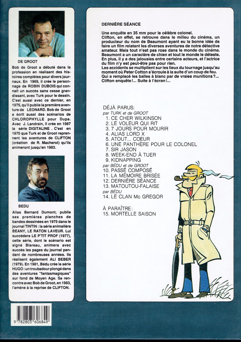 Clifton se retrouve dans le milieu du cinéma : un producteur du nom du Beaumont ayant eu la bonne idée de faire un film relatant les aventures de notre détective. Mais tout n'est pas aussi rose dans le monde du cinéma qu'on l'imaginerait. Beaumont a un caractère de chien et tout le monde le déteste. En plus, il y a des jalousies entre certains acteurs, et l'actrice principale n'y est peut-être pas pour rien. Les accidents se multiplient sur le tournage jusqu'au moment où Peter Cotton s'écroule à la suite d'un coup de feu. Clifton enquête...