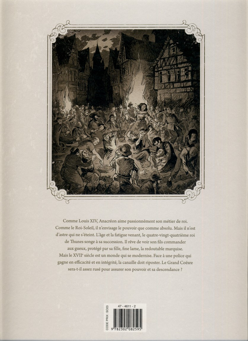 L’aventure palpitante d’un célèbre pouvoir monarchique né au Moyen-Âge, agissant en marge de la Cour du roi Louis XIV. Cette cour siégeait en plein cœur de Paris, dirigée par le roi Anacréon, le Grand Coësre, 84e du nom. Comme Louis XIV, Anacréon aime passionnément le métier de roi, et comme le roi Soleil, il n’envisage le pouvoir que comme absolu. L’âge et la fatigue venant, il songe à sa succession. Il rêve de voir son fils devenir le nouveau roi de Thunes, mais face à une police qui gagne en efficacité et en intégrité, la canaille doit se professionnaliser.... Lire la suite