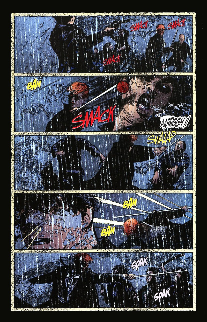 Ainsi, on suit en parallèle la prise de pouvoir de Daredevil sur Hell’s Kitchen après qu’il ait défait le Caïd puis son combat contre les Yakuzas et enfin sa convalescence en forme de dépression amoureuse (Daredevil 1998, #56-60). Puis, dans une deuxième histoire, se mêlent à nouveau une intrigue personnelle – l’abattement de Matt Murdock consécutif à la demande de divorce de son épouse, Milla Donovan – et une histoire super-héroïque entièrement consacrée à la Veuve noire, par ailleurs une ex de Murdock, poursuivie par le gouvernement et Billy Russo alias Jigsaw (#61-64). Pour ne pas changer, c’est encore le volet intime plus que les pirouettes costumées qui fait le sel de cette lecture.
