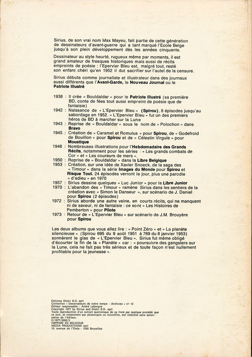 Info édition : Copyright 1954 by Sirius and Ed. Dupuis, Fils et Cie, S. P. R. L. + 1 planche sur ''Spirou'' page 47 + 1 planche sur "La planète silencieuse" page 48.