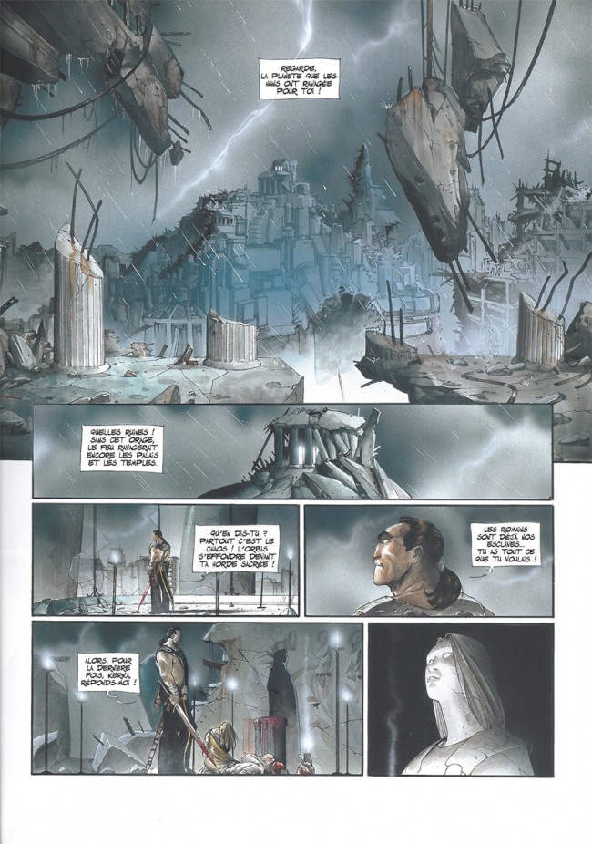 Le début de l'album est totalement en contradiction de la fin du précédent dans lequel notre héroïne est très bête et encaisse anormalement la trahison et la destruction de son monde tout en restant liée avec le traitre. Ici, elle est prostrée et il a fallu attendre la fin de l'album pour que Kerka réagisse (ou plutôt change de réaction) à ce qui lui est arrivé dans le tome 1, qui plus est, elle est muette presque tout l'album, pas un mot comme si un scénariste ou un interprète était complètement absent à la conception. C'est franchement mauvais. Elle est linéaire, ne fait office que de figurante, aucun charisme. De plus, je pense que personne ne l'a remarqué, mais il n'y a pas de numéros sur les pages. Je trouve ces deux premiers albums très mauvais et malheureusement sans intérêt. Pour moi, l'aventure s'arrête ici. Pour moi cette série et moize.
