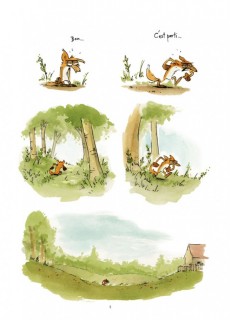 Des dessins simples sans case apparente, très expressifs au niveau des émotions et le mouvement qui donne un charme particulier à ce "méchant" renard, mais aussi tous les personnages secondaires : les trois poussins et le loup. Ciblant un large public, le récit se veut bon enfant, avec violence mesurée, mais toujours avec un humour bien dosée, qui réussi grâce au trait de Benjamin Renner, la mise en couleur à l'aquarelle donne une ambiance particulière aux compagnons de la foret et de la campagne. Sur environ 180 planches, j'ai ressenti quelques longueurs quant à la redondance des lieux, de plus il n'y a plus vraiment de nouveaux personnages introduits en cours de récits pour relancer le rythme de la bande dessinée. Les retournements restent sympathiques avec de belles surprises.