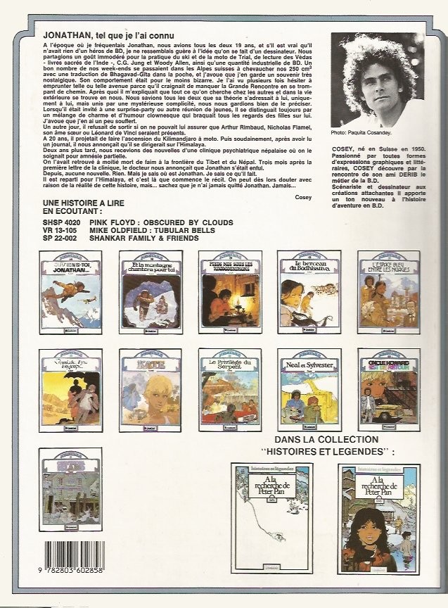 Tout grands amateurs de BD connaissent les aventures de Jonathan- poétiques, bien ficelées, ses aventures nous peignent un Tibet imprégné de ses coutumes et d'un héros amnésique qui respire la gentillesse et la sympathie ! La mise en page est novatrice ( voir les 5 premiers tomes !) Magnifique et magique !
