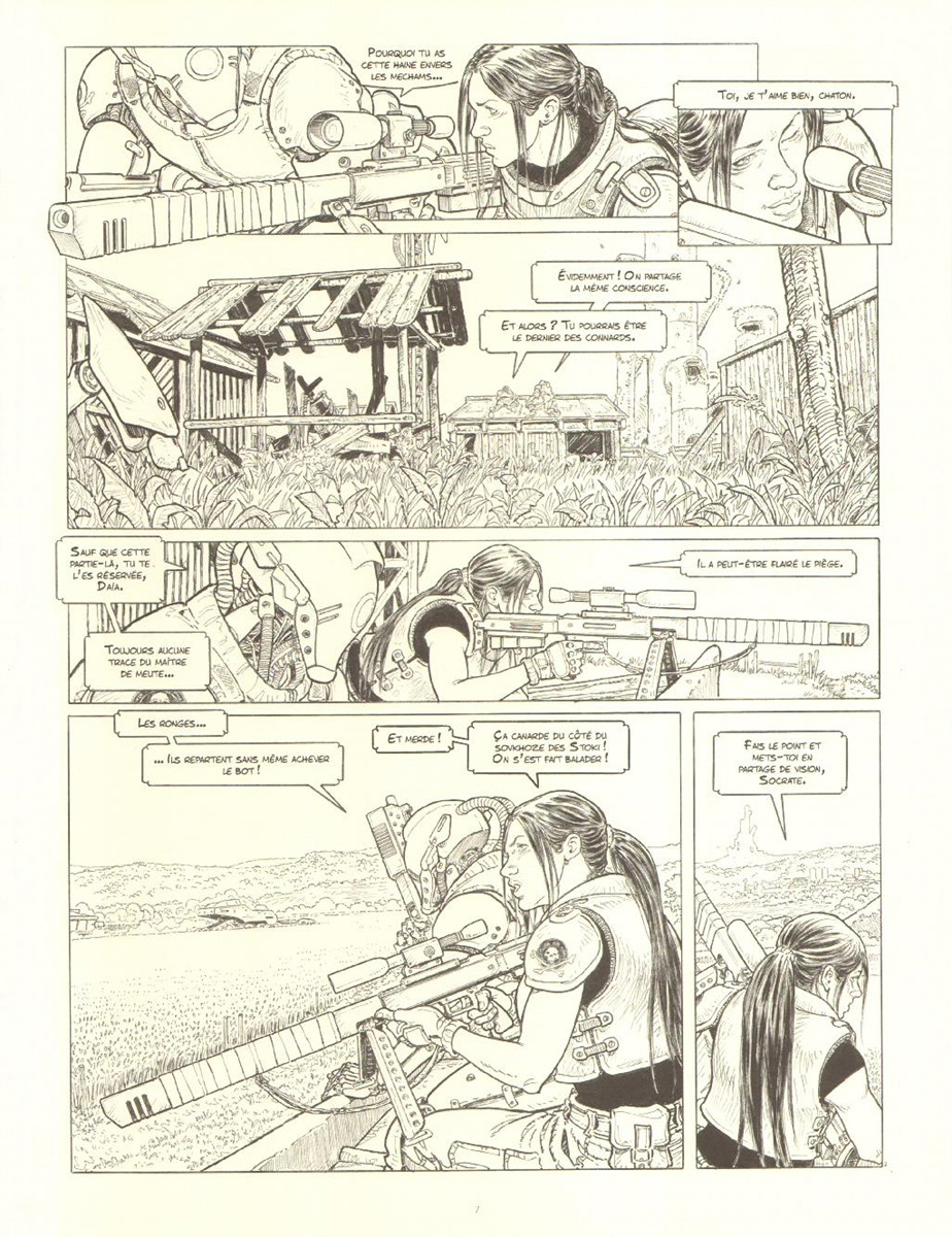 Pour rebondir sur "Vacom", certes la voix off est très présente mais n'est aucunement un handicap dans cette bonne BD, il s'agit simplement de la narration de notre héroïne. Je n'y vois pas trop non plus d'univers postapocalyptiques si ce n'est une attaque permanente des robots autonomes d'une manière très linéaire et infondée... Toutefois il n'y a rien de pertinent à ce qu'un spirit partage sa conscience avec un bot ou même deux. D'un point de vue existentiel c'est très fade.