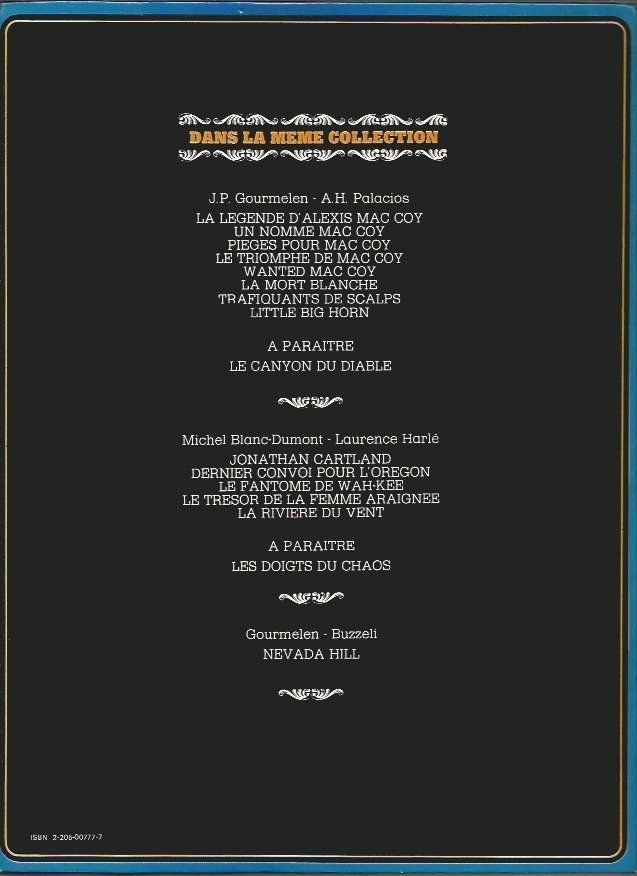 Info édition : Dépôt légal : 4e trimestre 1981 - Au 4e plat, noté "Dans la même collection", "J.P. Gourmelen – A.H. Palacios" 7 titres dont le dernier "Trafiquants de scalps", "À paraître, Little Big Horn", "Michel Blanc-Dumont – Laurence Harlé" 5 titres dont le dernier "La rivière du vent", "À paraître, Les doigts du chaos", "Gourmelen – Buzzeli, Nevada Hill".