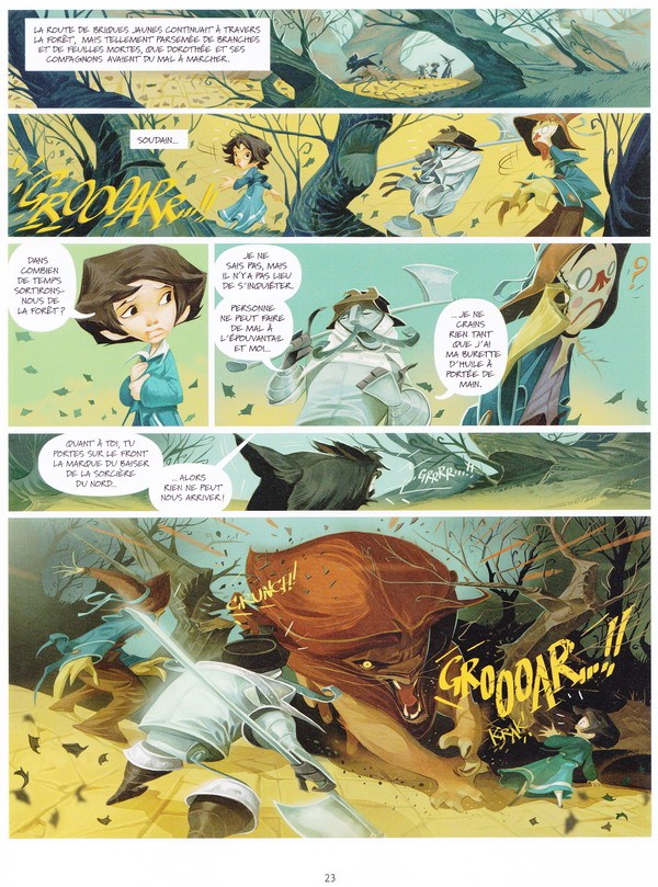 Les dessins sont superbe par un trait pure, malgrè le fait que je trouve que Dorothée resemble quelque fois à un garçon :? . Et les couleurs sont somptueuses lumineuse, contasté,. Elles subliments le dessin pour créer un monde rappellant illustrés les livres pour les enfants qui nous replonge dans notre enfance.