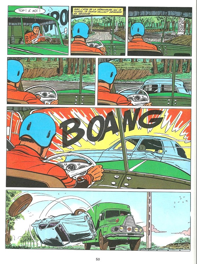 Alors Les casse-cou un album un peu casse c… Euh pieds ? C’est pas que mais. C'est qu'il faut que jeunesse se fasse. Alors, adieu 403, Simca et et autres Dauphine rembourrées, parce qu’on le veuille ou non, une Vaillante ce sera toujours deux belles rangées de cylindres, le bon paquet de bougies qui va avec, des bielles bien dressées et des pistons qui n’ont pas peur d’une bonne petite explosion. Sans oublier une bonne bande de pignons dociles et un bel arbre. A cames en tête de préférence.