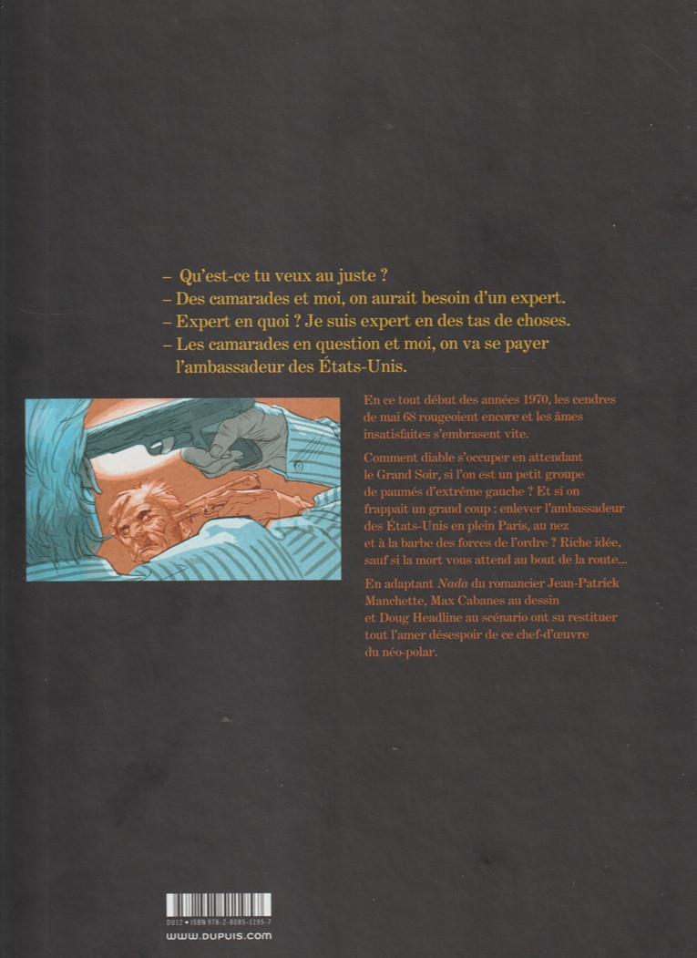 Ils sont six : Épaulard, l'expert vieillissant ; D'Arcy, l'alcoolique violent ; Buenaventura Diaz, le caméléon aux identités multiples ; Treuffais, le prof de philo désabusé ; le jeune Meyer, dont la femme folle finira bien par le tuer un de ces quatre ; et Cash, la putain auto-proclamée à l'intelligence troublante. Des profils aussi disparates que leurs passés respectifs. Pourtant, ensemble, ces paumés d'extrême gauche formeront le groupe « Nada ». Leur premier coup d'éclat : enlever l'ambassadeur américain, en visite discrète dans une maison... Lire la suite