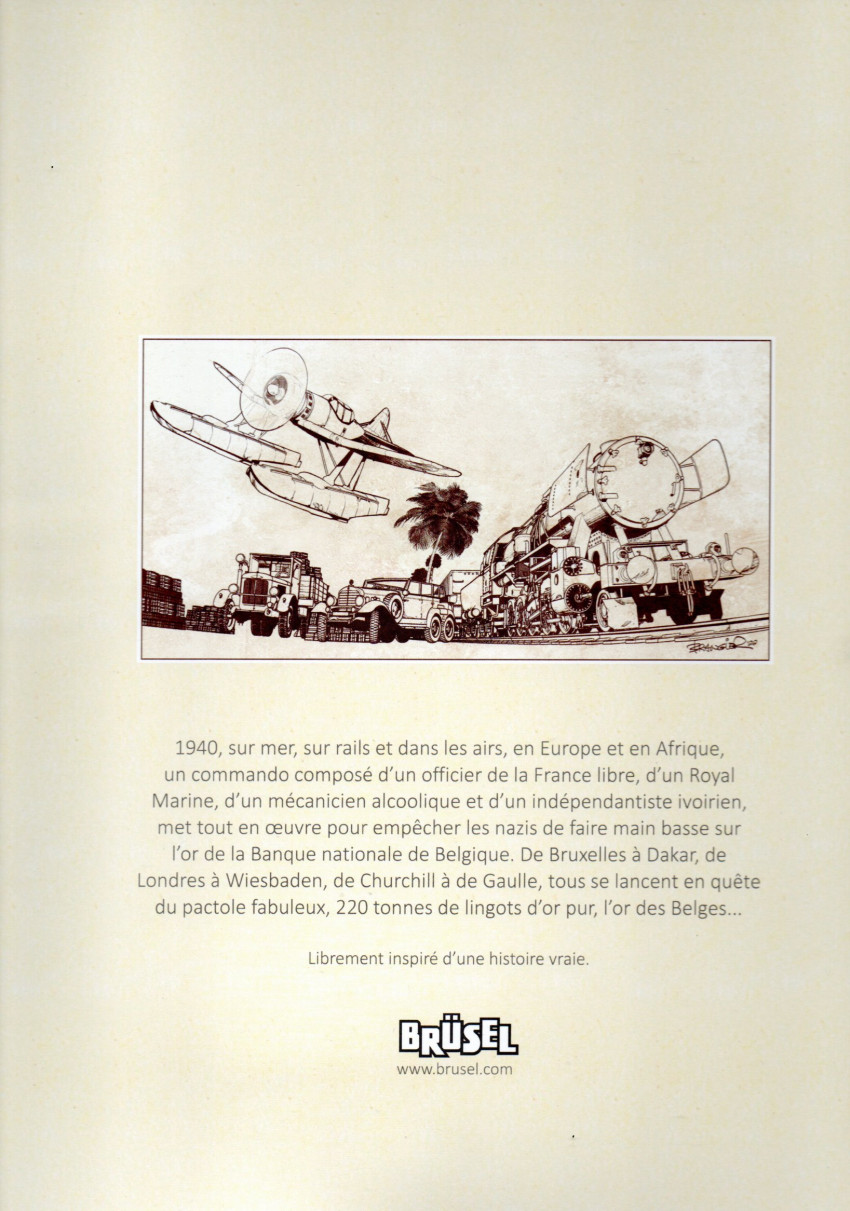1940, les Nazis veulent s'emparer de la réserve d'or de la Belgique. Le roi Léopold III la confie alors à la France, qui l'envoie à Dakar... Où les Allemands la chargent dans un train qui traverse l'Afrique, direction Berlin. Un Royal Marine, un ex-officier français, un mécano alcoolique et un indépendantiste ivoirien engagent alors une course poursuite pour récupérer l'Or des Belges. D'un authentique fait de guerre, Pierre Boisserie et Philippe Guillaume ont tiré une BD d'aventure historique où se conjuguent drame et humour, mis en lumière par... Lire la suite
