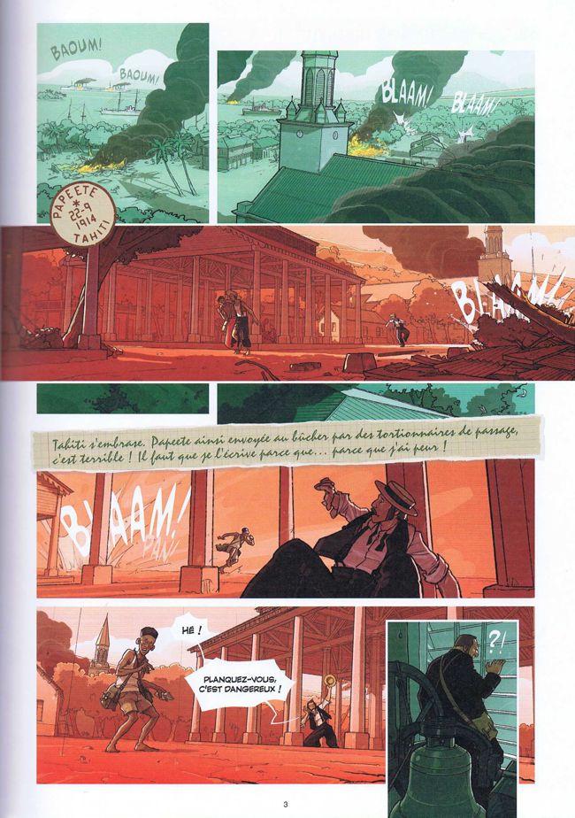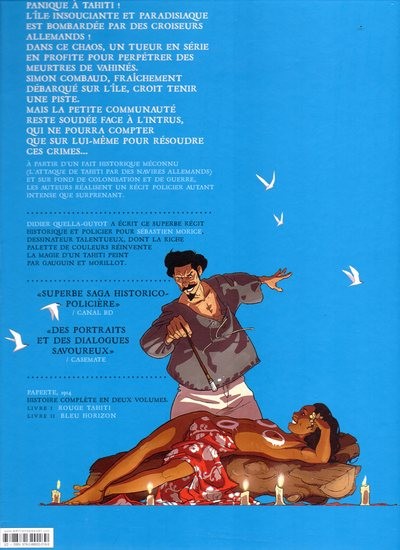 Panique à Tahiti ! L’île insouciante et paradisiaque est bombardée par des croiseurs allemands ! Dans ce chaos, un impitoyable tueur en série en profite pour perpétrer des meurtres de vahinés… Simon Combaud, jeune parisien fraichement débarqué sur l’île, croit tenir une piste. Mais dans la tourmente de la Première Guerre mondiale, la petite communauté reste soudée face à l’intrus, qui ne pourra compter que sur lui-même pour résoudre ces crimes odieux… A partir d’un fait historique méconnu et sur fond de guerre, colonisation, racisme, art, les auteurs... Lire la suite