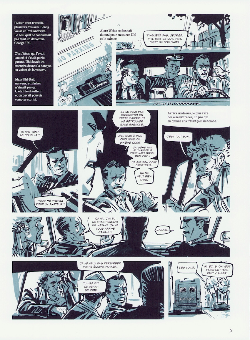 Quand il s'agit de bâtir le scénario d'un polar pour une BD, Doug Headline n'en est pas à son coup d'essai, on l'a dit, et il a su trouver le ton juste pour dérouler ce récit en comblant les silences de Parker, personnage taciturne, par de brefs encarts de texte, une sorte de voix off.