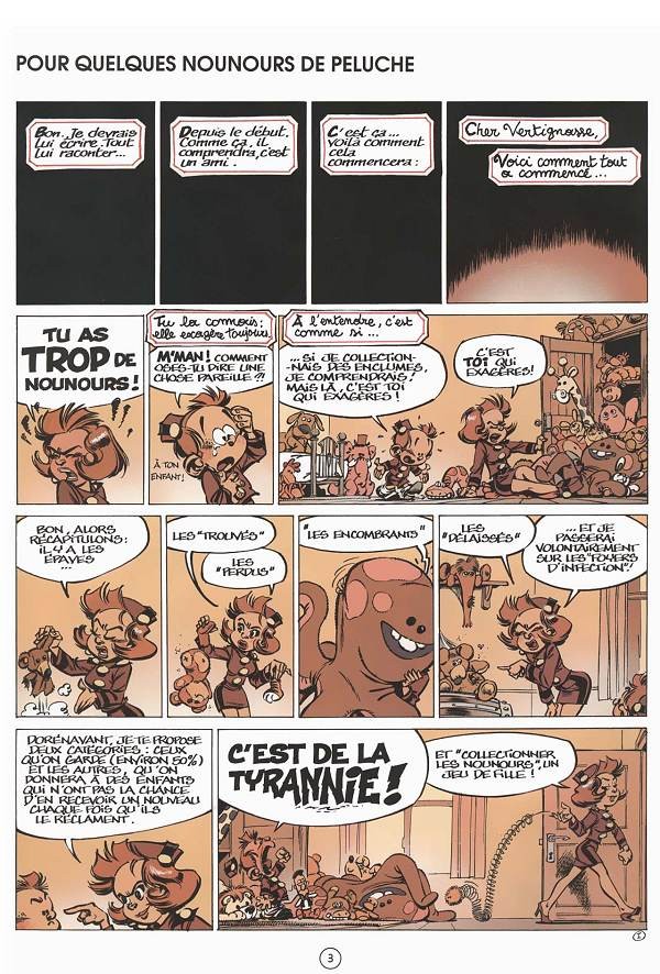 Le moyen métrage de début est consacré à la difficulté de se débarrasser de ses vieux jouets... Car le petit Spirou collectionne des centaines de jouets en peluche, et sa maman souhaiterait qu'il se sépare d'au moins la moitié d'entre eux. Mais comment choisir ceux dont on va se séparer ??? Ensuite la succession de strips prolonge l'album avec l'apparition de Madame Gourmandine, amie secrète du Pépé du petit Spirou...