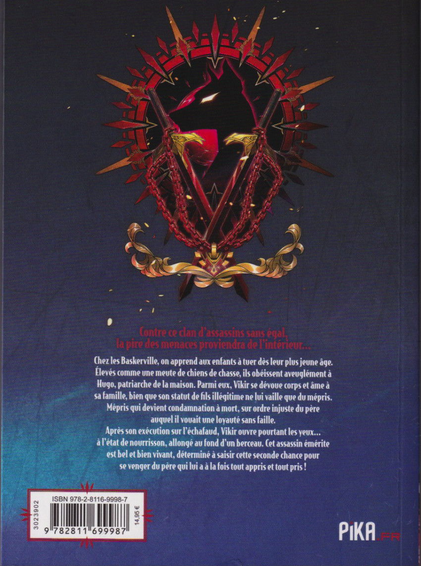 Contre ce clan d'assassins sans égal, la pire des menaces proviendra de l'intérieur... Chez les Baskerville, on apprend aux enfants à tuer dès leur plus jeune âge. Élevés comme une meute de chiens de chasse, ils obéissent aveuglément à Hugo, patriarche de la maison. Parmi eux, Vikir se dévoue corps et âme à sa famille, bien que son statut de fils illégitime ne lui vaille que du mépris. Mépris qui devient condamnation à mort, sur ordre du père auquel il vouait une loyauté sans faille. Après son exécution sur l’échafaud, Vikir ouvre pourtant les... Lire la suite