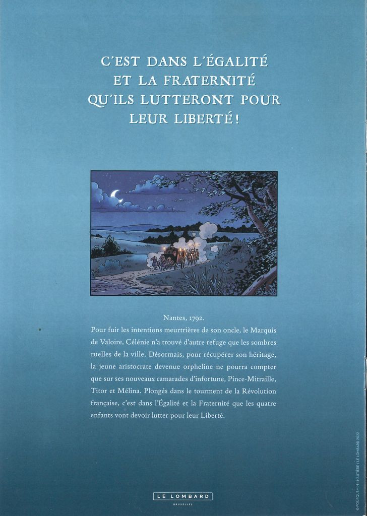 Nantes, 1792. Pour fuir les intentions meurtrières de son oncle, le Marquis de Valoire, Célénie n'a trouvé d'autre refuge que les sombres ruelles de la ville. Désormais, pour récupérer son héritage, la jeune aristocrate devenue orpheline ne peut plus compter que sur ses nouveaux camarades d'infortune, Pince-Mitraille, Titor et Mélina. Plongés dans le tourment de la Révolution Française, c'est dans l'Égalité et la Fraternité que les quatre enfants vont devoir lutter pour leur Liberté.