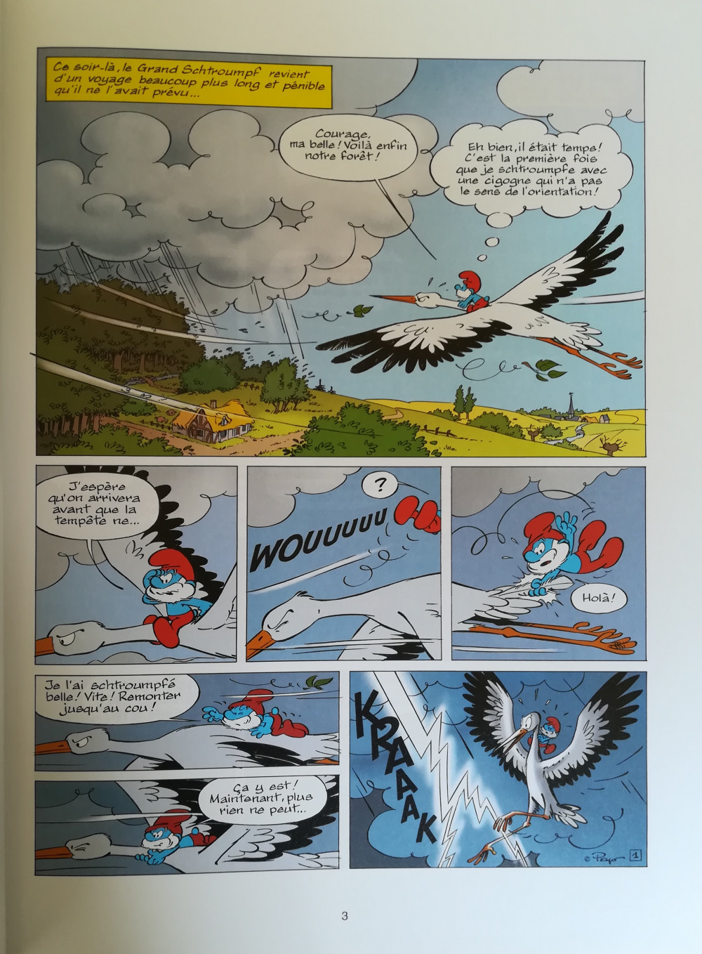 La Cigogne, qui tentait péniblement de ramener le Grand Schtroumpf au village, est surprise par un orage et blessée. Un fermier des environs du village soigne l'animal. Sa gentillesse est aussi grande que la méchanceté de son neveu est terrible. Jeanty, le neveu, débarque par erreur dans le village des petits lutins bleus et y sème une pagaille incommensurable...