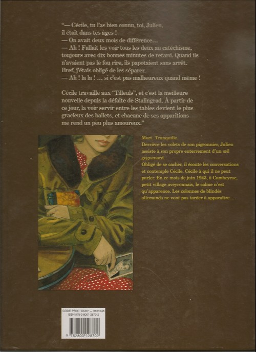 Voici une excellente BD. Le scénario est vraiment béton. Il est très profond et bien mené. On a l'impression d'être se déserteur à la fois libre et prisonnier en même temps. Prisonnier de sa situation vis à vis des allemand mais aussi de ses sentiments pour Cecil qui lui font imaginer toute sorte de chose le faisant sans cesse passer de la joie à la colère.