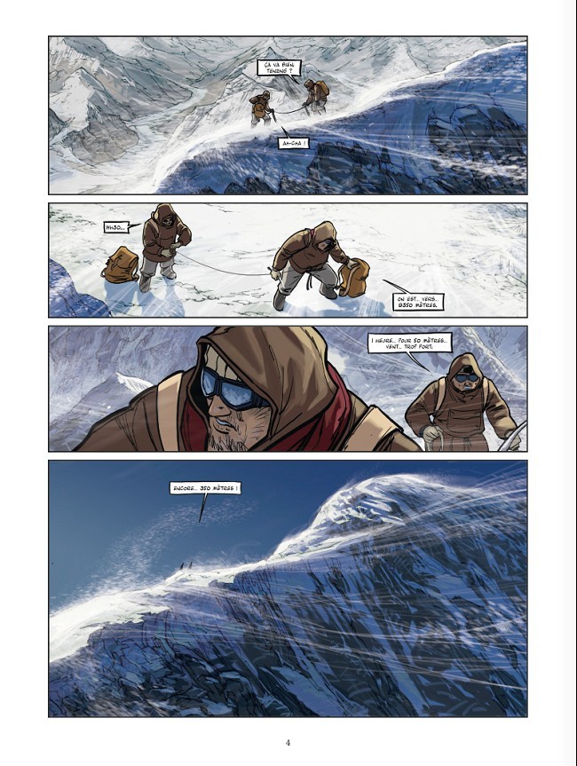 Coté scénario, ce cinquième tome de la collection Glénat_Explora (qui retrace l’existence d’hommes et de femmes partis à la découverte du globe et dont les expéditions ont marqué l’Histoire, du moins leur temps) est intéressant. Les auteurs ont privilégié le contexte historique et géopolitique plus que l'exploit lui-même. Si du coup c'est peut-être un peu trop résumé, et trop succinct concernant le vécu du point de vue des protagonistes (Edmund Hillary et Tenzing), l'essentiel est là pour nous plonger dans cette fabuleuse aventure finalement méconnue dans les détails ahurissants dont on a peine à imaginer la réalisation.. 8 tonnes ! de matériels acheminés par des centaines de porteurs, des semaines de marche d'approche et d'acclimatation, contexte politique compliqué.. à découvrir sans hésiter.