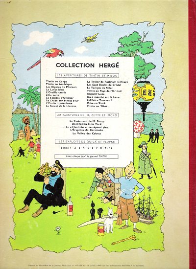- une édition originale française avec mention "Redoutable" sur les bérets des Dupond(t) en pages de garde au 3e plat. Noté page 62 : Éditions Casterman, Paris – N° 715 – Dépôt légal 3e trimestre 1960 - Imprimé en France par L. P.-F. Léonard DANEL – LOOS (Nord) – N° 3200.