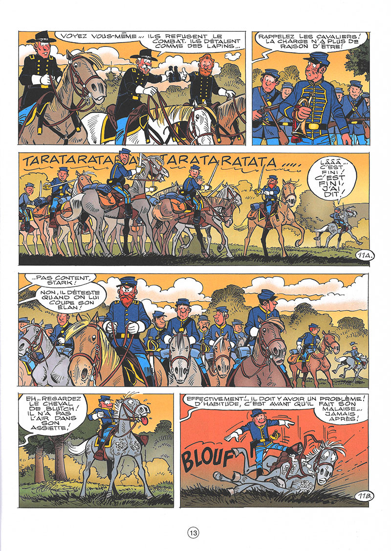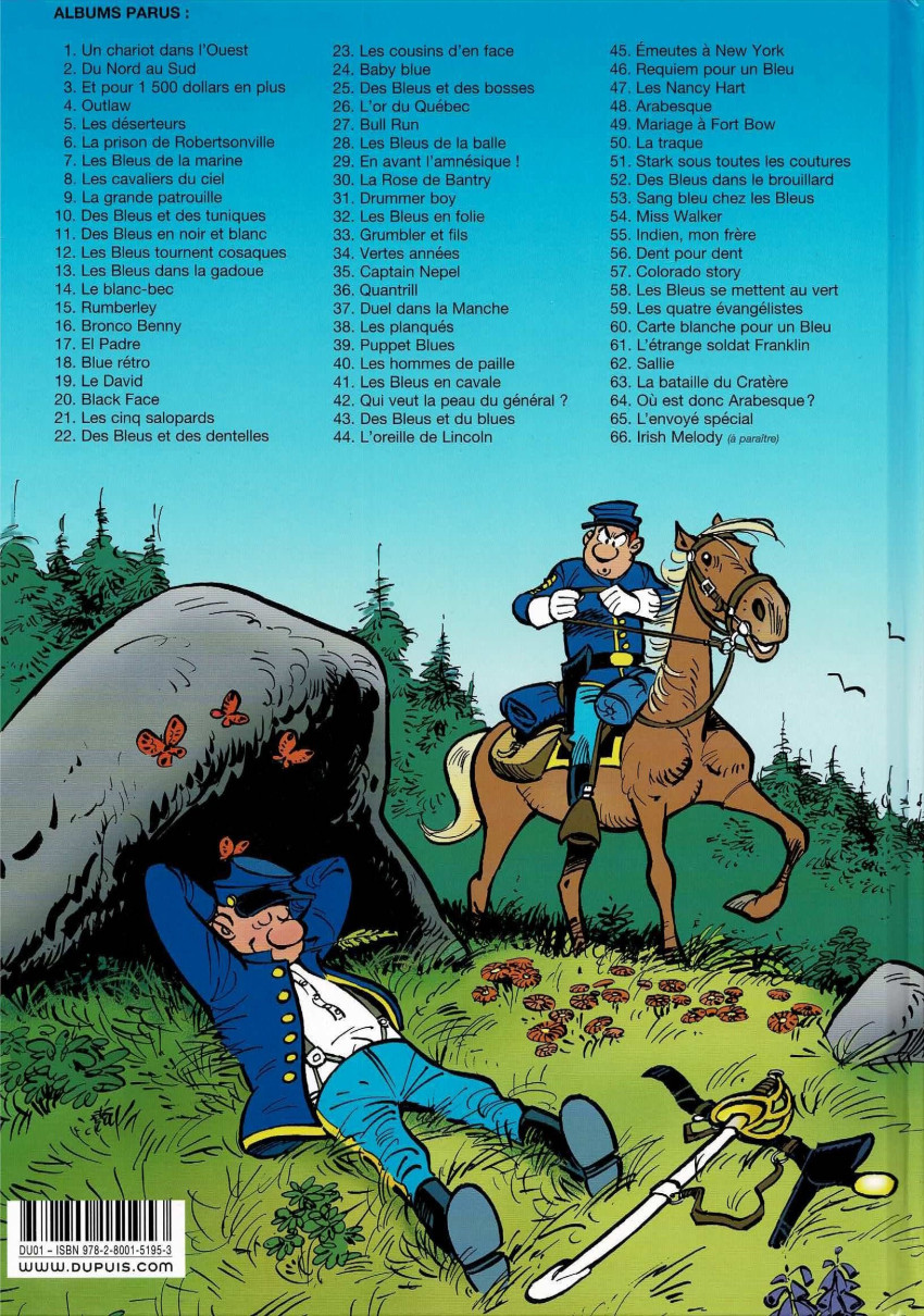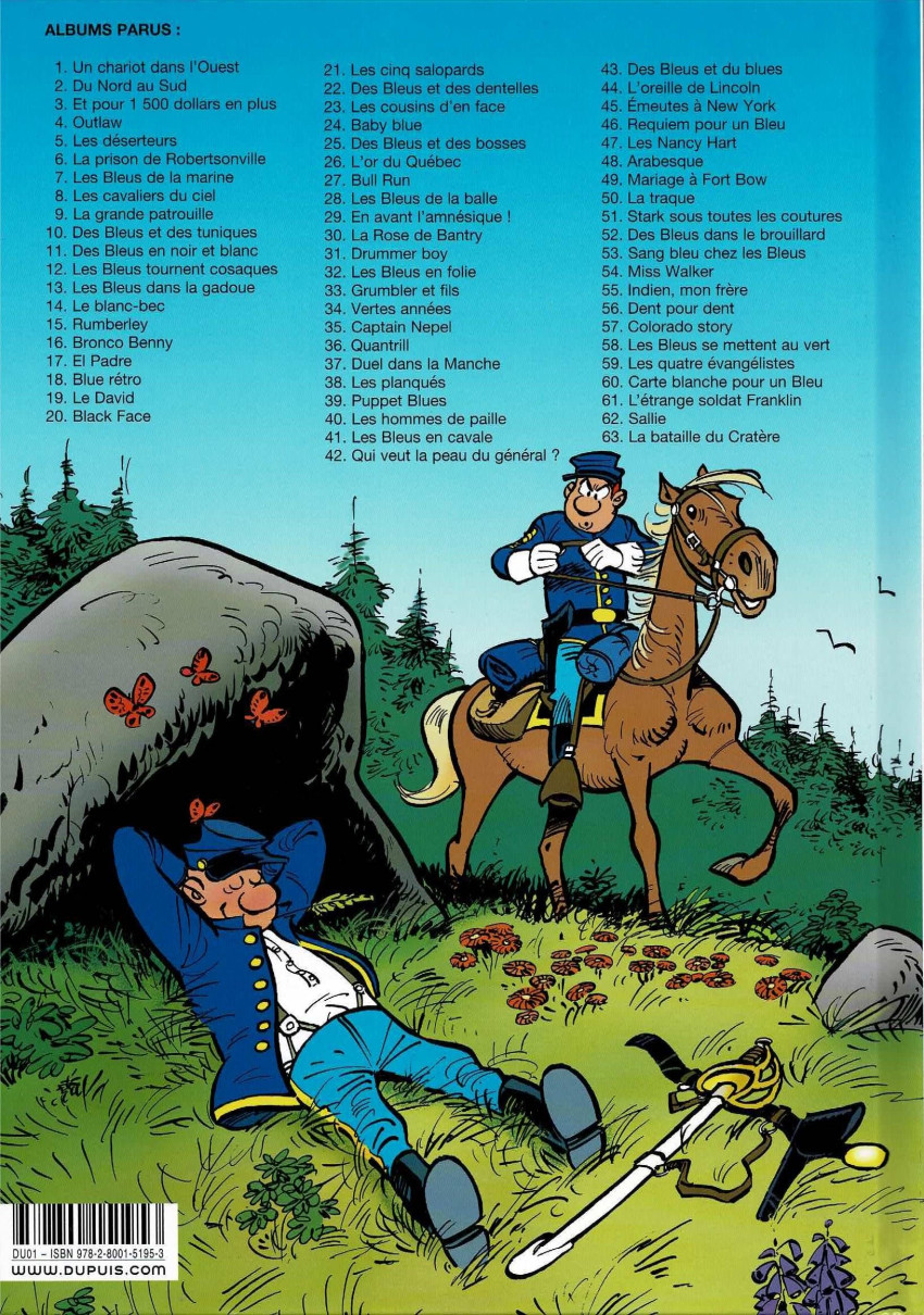 Cela faisait très longtemps que je ne m'étais pas plongé dans un album des tuniques bleues. Les avis lus ici ou là me donnaient à penser que ce serait certainement pénible tant la qualité de la série semblait avoir mis les adjas depuis un bail. Par hasard, on m'a refilé ce 56ième tome des aventures de Blutch et Chesterfield que j'ai fini par lire des mois plus tard. Eh bien j'ai aimé. J'ai retrouvé ce qui a fait le charme de la série. J'ai même ri deux ou trois fois, truc impensable avant de tourner la première page. Du coup je me dis que je vais sûrement en lire d'autres ,30 piges après avoir raccroché. Comment expliquer ce revirement inouï? En y réfléchissant bien, il se présente alors deux éventualités: la première est que j'ai dramatiquement décliné intellectuellement ces dernières années. La seconde que "Les tuniques bleues" n'a pas si mal vieillie. L'optimisme prescrit de cocher la réponse deux, je m'empresse donc de le faire.