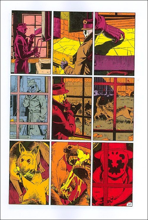 Enorme, les magnifiques dessins de Gibbons mettent en image le scénario géniale d'Alan Moore ; l'ambiance reste longtemps ancrée en nous après la lecture, à la fois animée par les décors urbains sombres, qui sortent parfois de la ville pour montrer des images des fois surréalistes et fantastiques ; et aussi par des personnages profonds, qui nous émeuvent autant qu'on les admire. Je suis d'accord pour l'idée de chef d'oeuvre!!