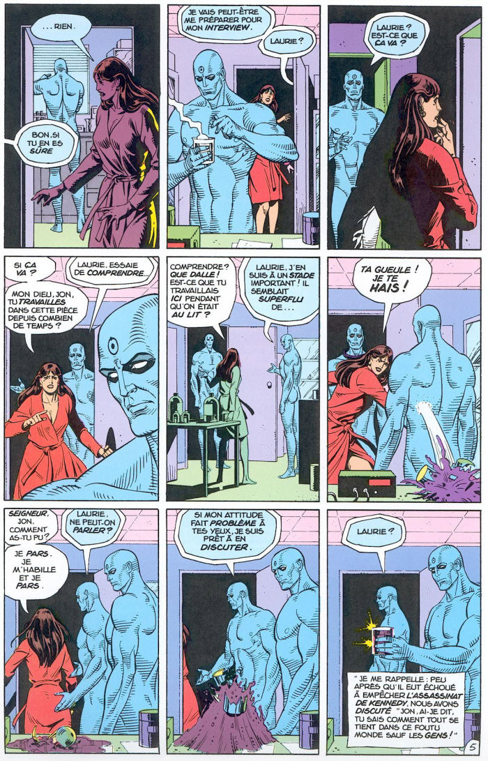 Bref, j'ai lu Watchmen (en quelques jours), en sachant à quoi m'attendre vu que je connaissais l'histoire, et pourtant je me suis surpris à être étonné, ému, surpris (surpris d'être surpris, si c'est pas fort ça...).