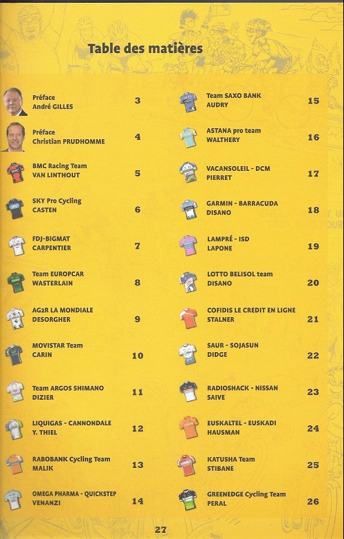 Commentaire : Livret de 28 pages édité à l'occasion du Tour de France 2012 dont le départ était donné à Liège. Il s'agit d'un recueil de 22 dessins rendant hommages aux 22 équipes prenant le départ. Sommaire reprenant la liste des dessinateurs en image 2 (le verso ne représentant que peu d'intérêt).