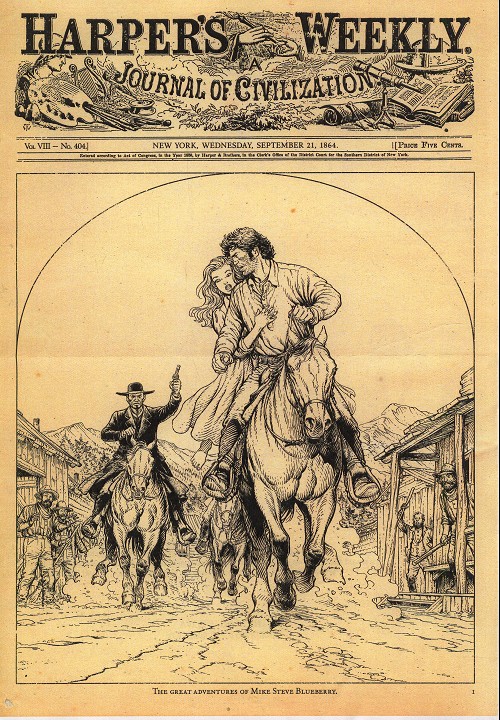 Commentaire : Ce journal se veut le n° 404 du mercredi 21 septembre 1864 de "Harper's Weekly, a Journal of Civilization". Il compte quatre pages en anglais, la dernière présentant une biographie de Mike Steve Donovan alias Blueberry.