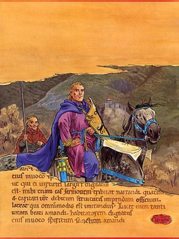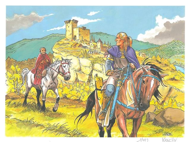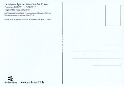 Commentaire : Carte postale éditée et diffusée pour la promotion de l'exposition "Bande dessinée et histoire # 4 - Le Moyen-Age de Jean-Charles Kraehn" du 07/12/20011 au 03/02/2012 aux Archives Départementales à Rennes (35).