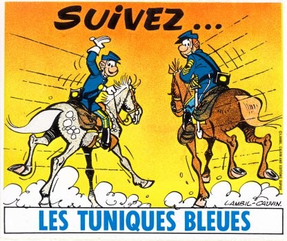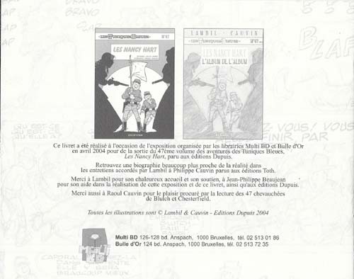 Commentaire : Ce livret de douze pages a été réalisé à l'occasion de l'exposition organisée par les librairies Multi BD et Bulle d'Or en avril 2004 pour la sortie du 47ème volume des aventure des Tuniques Bleues, Les Nancy Hart, paru aux éditions Dupuis.