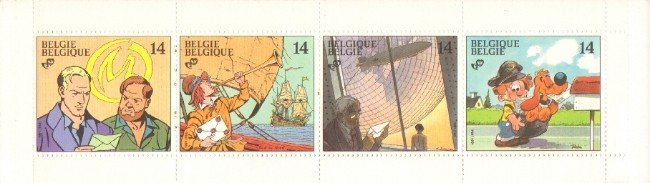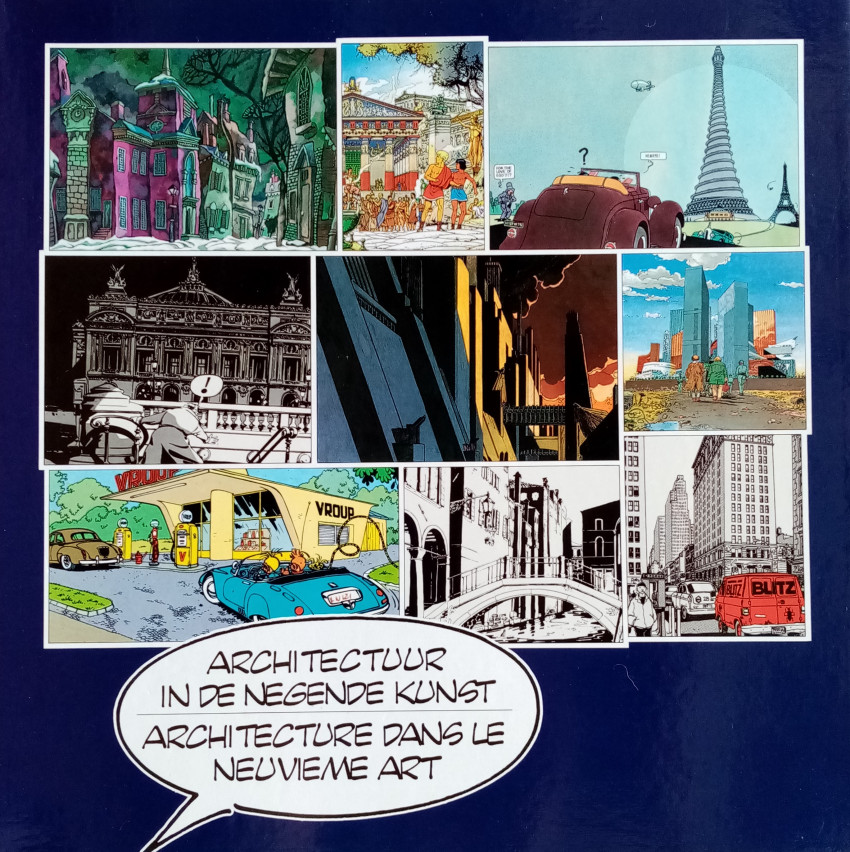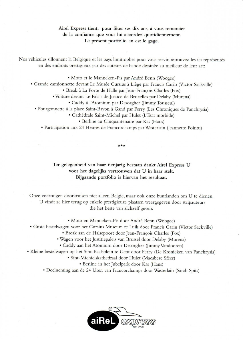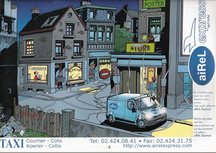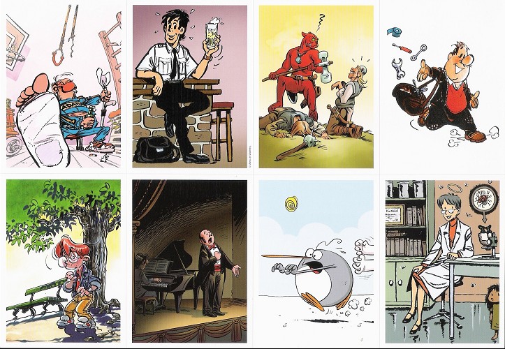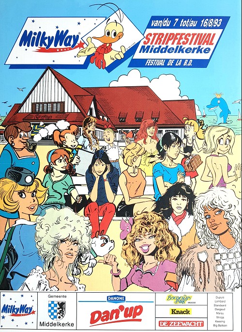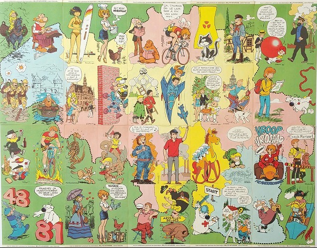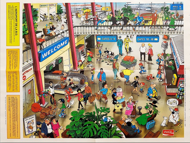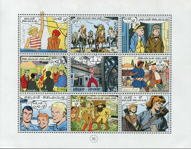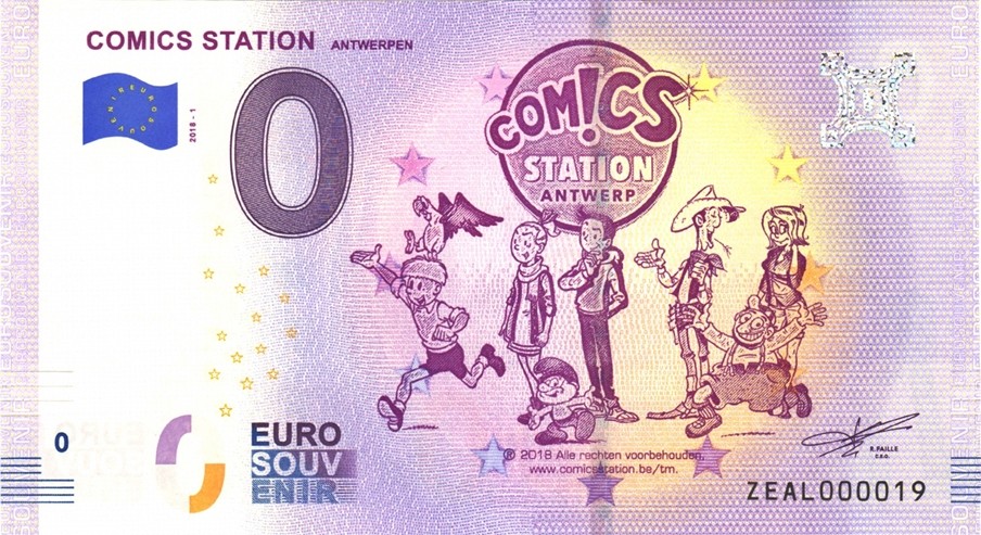 Commentaire : Pour le parc d'attraction Com!cs Station à Anvers. Les auteurs : Jeff Nys (Gil et Jo), Vandersteen (Bob et Bobette) Peyo (Schtroumpfs), Morris (Lucky Luke), Willy Linthout (Urbanus) et Merho (Fanny et Co).