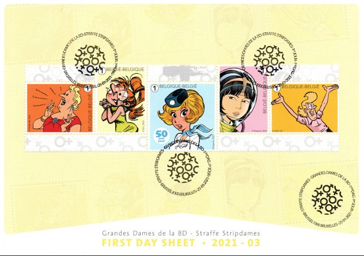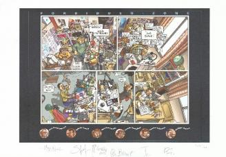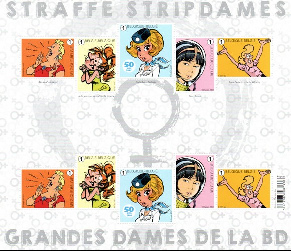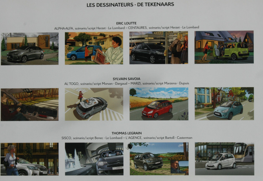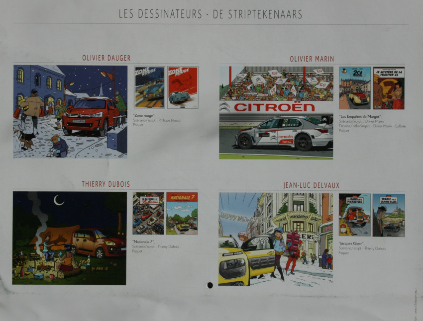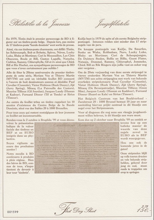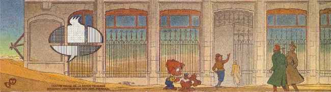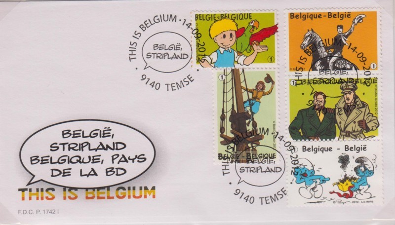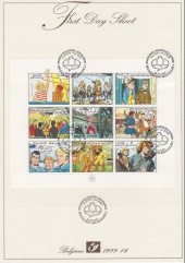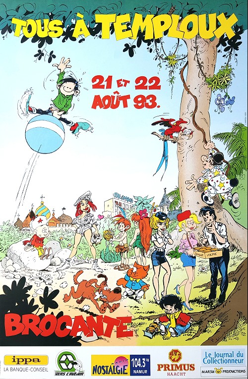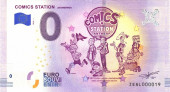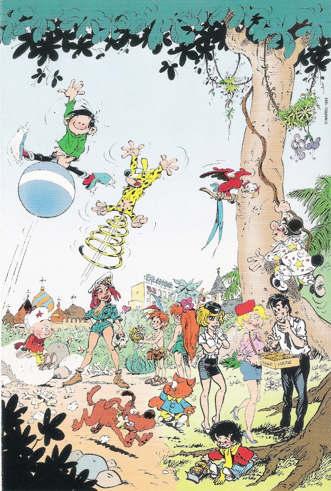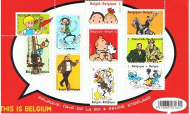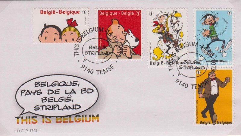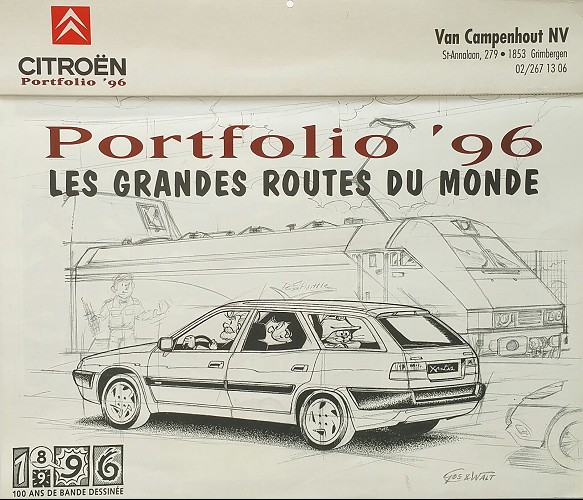 Commentaire : Pour le parc d'attraction Com!cs Station à Anvers. Les auteurs : Jeff Nys (Gil et Jo), Vandersteen (Bob et Bobette) Peyo (Schtroumpfs), Morris (Lucky Luke), Willy Linthout (Urbanus) et Merho (Fanny et Co).