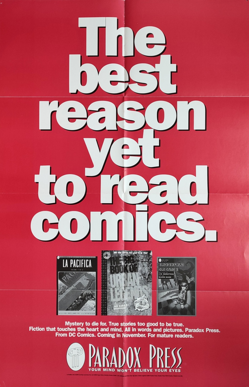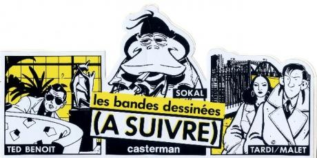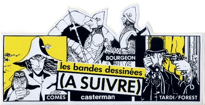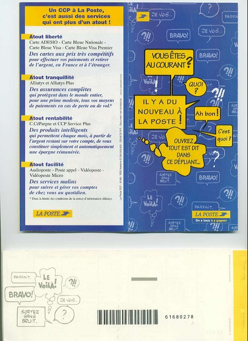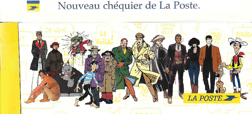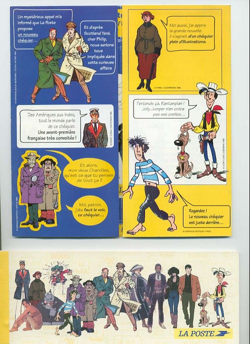 Commentaire : Présentoir annonçant le nouveau chéquier de 25 chèques illustrés par Gharlier/Giraud, Goscinny/Tabary, Bourgeon/Lacroix, Hugo Pratt, Geluck, Gotlib, Morris, Vance/Van Hamme, Fred, Tardi, Edgard P. Jacobs, Cothias/Juillard. Au dos, l'emplacement d'un petit autocollant pour disposer ce visuel sur une vitrine par exemple.