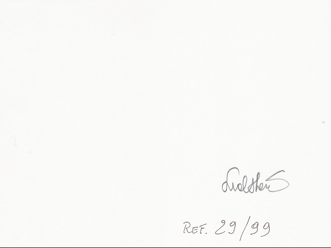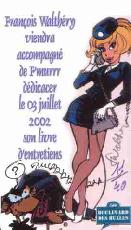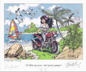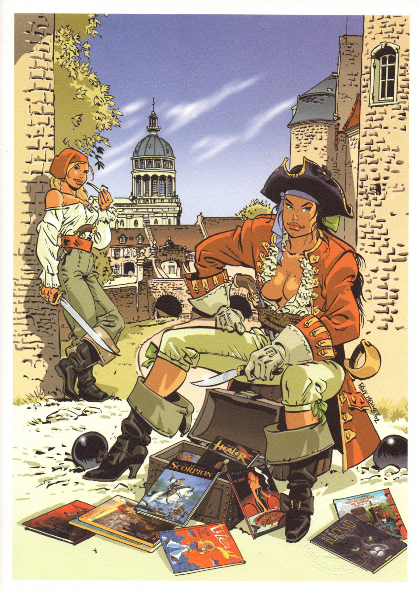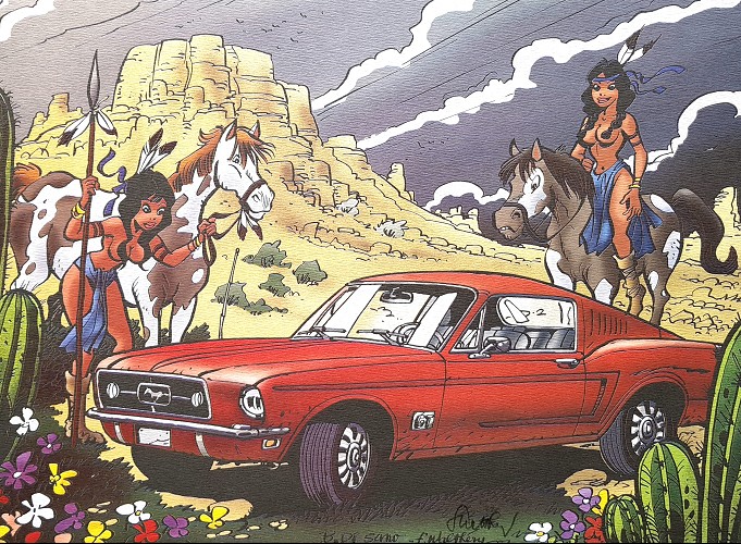 Commentaire : Le "Mousquetaire". Ex-libris faisant partie de la série "voiture" en couleur. Ces ex-libris sont réalisés par différents auteurs : F. Walthéry pour les décors et les pin-up, le ou les autres auteurs pour la voiture et d'autres éléments. Ici, Brice GOEPFERT. Signé par les 2 auteurs.Remarque : Brice Goepfert a pris pour "argent comptant" le mot véhicule et est parti sur un cheval et son mousquetaire.