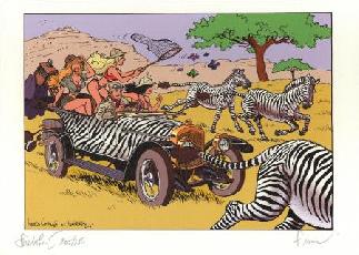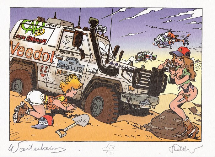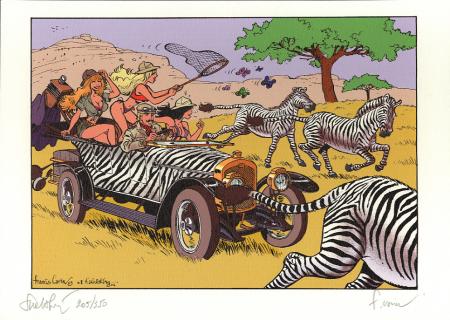 Commentaire : "La voiture de safari ancienne". Ex-libris faisant partie de la série "voiture" en couleur. Ces ex-libris sont réalisés par différents auteurs : F. Walthéry pour les décors et les pin-ups, le ou les autres auteurs pour la voiture et d'autres éléments. Ici F. Carin. Signé par les 2 auteurs.
