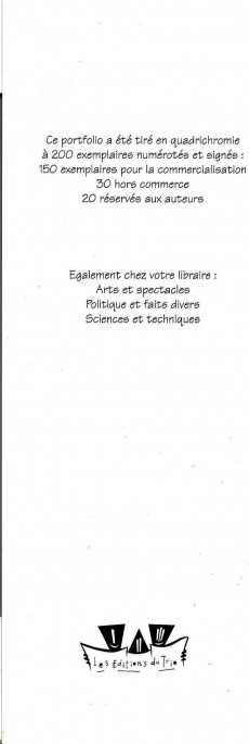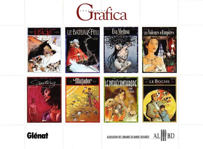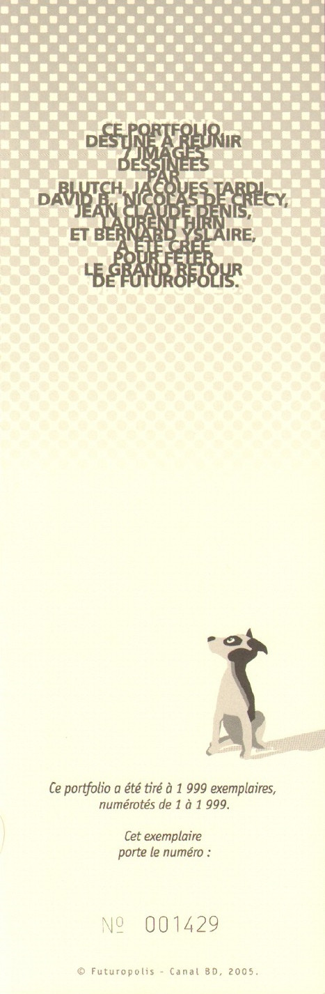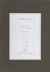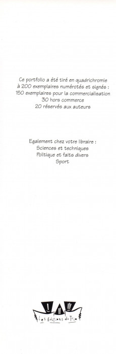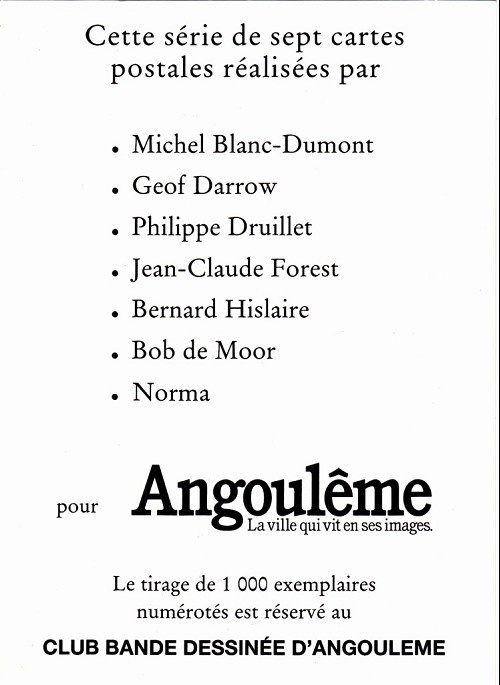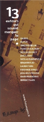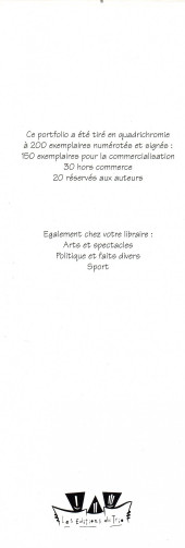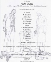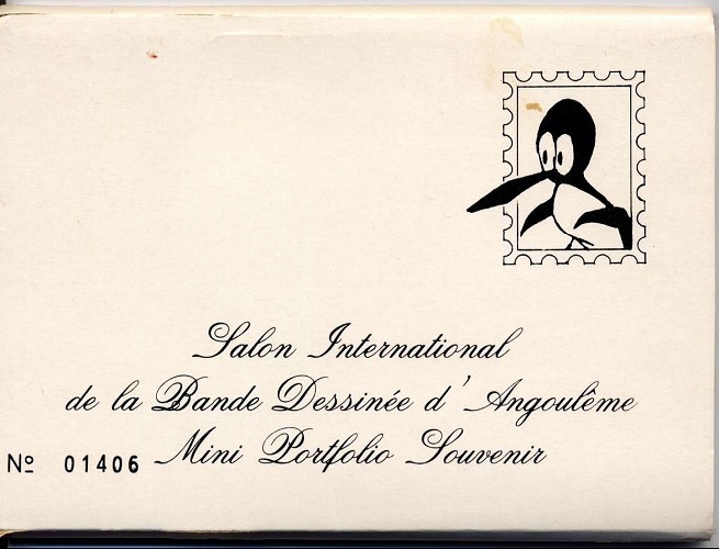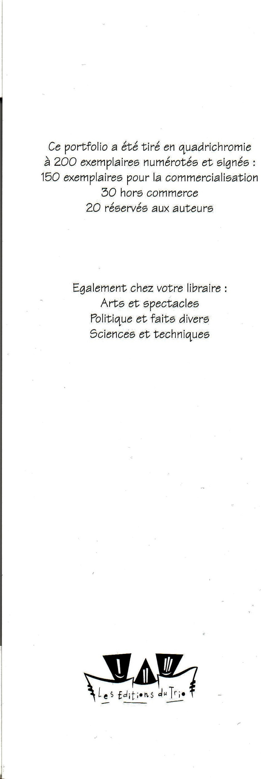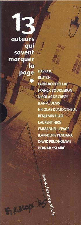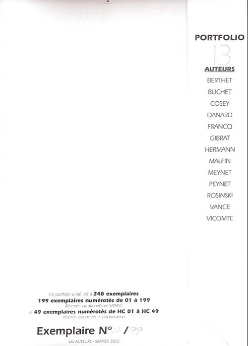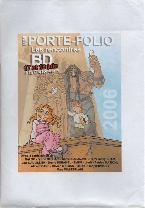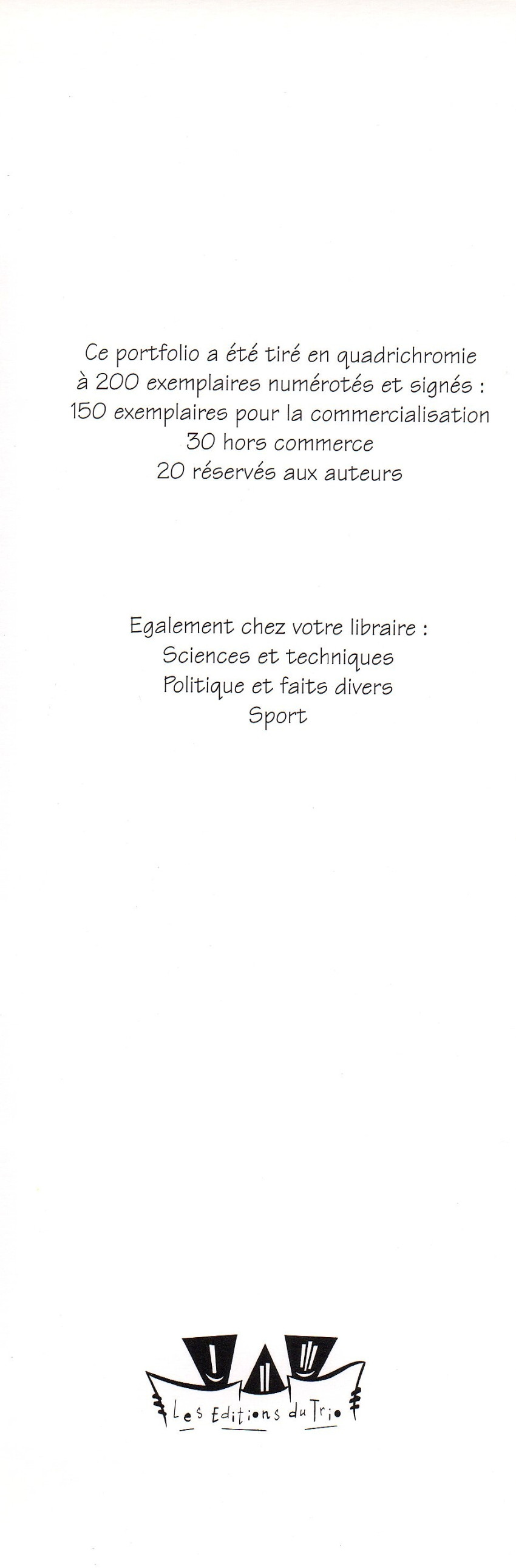 Commentaire : Ce portfolio, présenté sous la forme d'un dépliant, contient 18 illustrations (souvent reprises des couvertures) dessinées par Nicolas de Crécy, Marc-Antoine Mathieu, Éric Liberge, Bernard Yslaire, Hirohiko Araki, Christian Durieux, David Pruhomme, Enki Bilal, Étienne Davodeau, Jirô Taniguchi, Florent Chavouet,